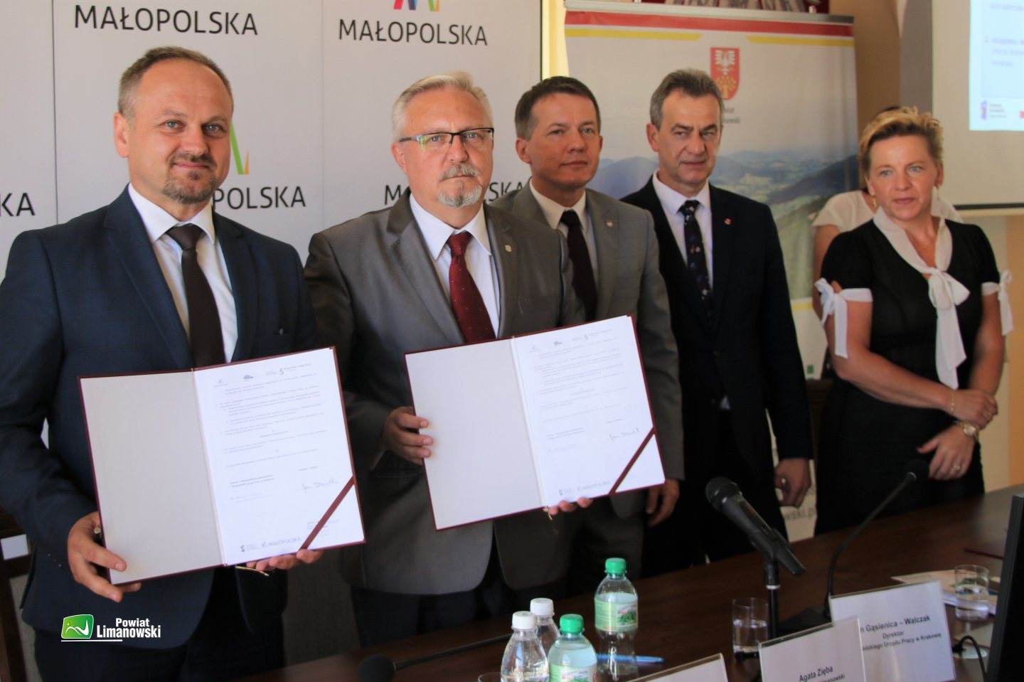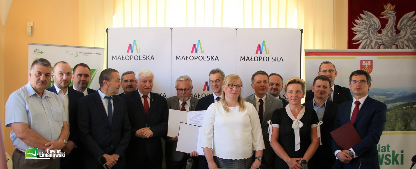 10 czerwca w Starostwie Powiatowym w Limanowej odbyło się spotkanie, podczas którego przedstawiciele Powiatu Limanowskiego, a także wójtowie i burmistrzowie z samorządów z terenu powiatu limanowskiego podpisali umowy realizowane przez WUP obejmujące projekty: Kierunek Kariera, Kierunek Kariera Zawodowa oraz Nowy Start w Małopolsce. Umowy finansowane są ze środków Regionalnego Programu Operacyjnego Województwa Małopolskiego na lata 2014-2020, działanie 10.3 „Rozwój kompetencji i umiejętności osób dorosłych” współfinansowanego przez Unię Europejską ze środków Europejskiego Funduszu Społecznego.