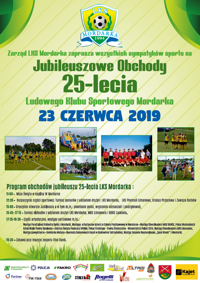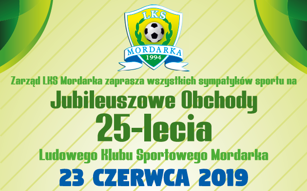 Zarząd LKS Mordarka zaprasza wszystkich sympatyków sportu na Jubileuszowe Obchody 25-lecia Ludowego Klubu Sportowego Mordarka. W programie wiele atrakcji dla każdego - turnieje, zabawy dla dzieci, występy artystów, mała gastronomia. Uroczystości zakończą się zabawą z zespołem Viva Band. WSTĘP WOLNY!