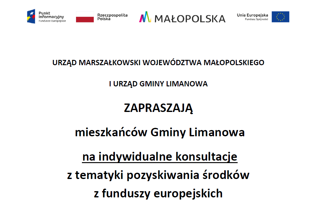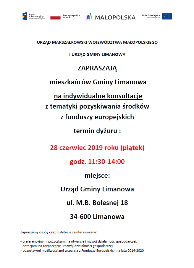 Urząd Marszałkowski Województwa Mąłopolskiego i Urząd Gminy Limanowa zapraszają mieszkańćów gminy Limanowa na indywidualne konsultacje z tematyki pozyskiwania środków z funduszy europejskich. Dyżur konsultanta odbędzie się 28 czerwca 2019 roku (tj. piątek) w godz. 11.30 - 14.00 w Urzędzie Gminy Limanowa.