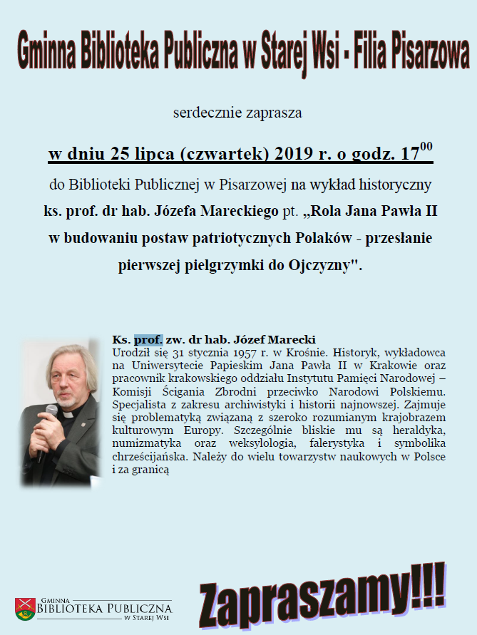 Gminna Biblioteka Publiczna w Starej Wsi - Filia w Pisarzowej zaprasza w dniu 25 lipca (czwartek) 2019 r. o godz 17.00 do Biblioteki Publicznej w Pisarzowej na wykład historyczny ks. prof. dr hab. Józefa Mareckiego pt. „Rola Jana Pawła II w budowaniu postaw patriotycznych Polaków - przesłanie pierwszej pielgrzymki do Ojczyzny".