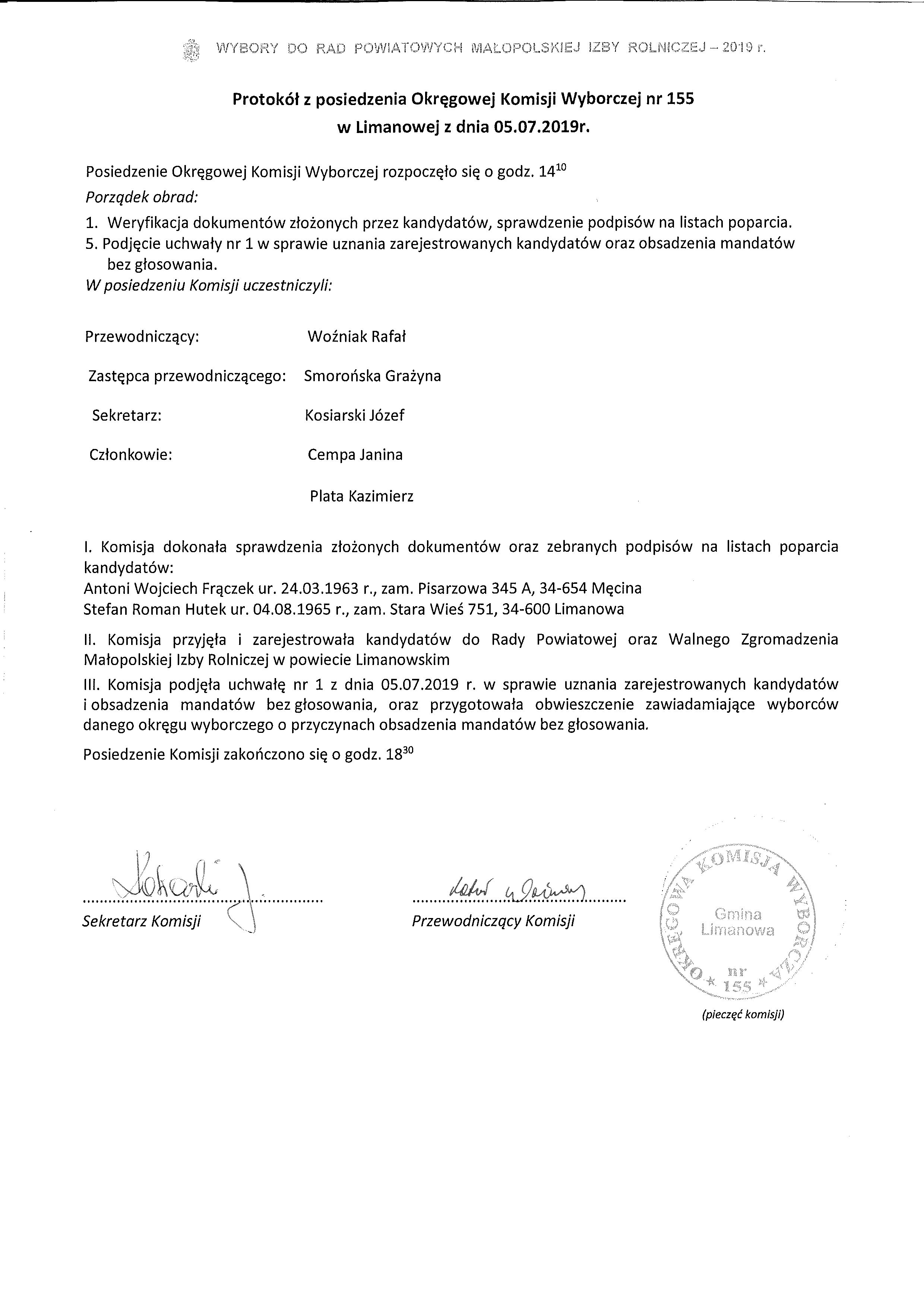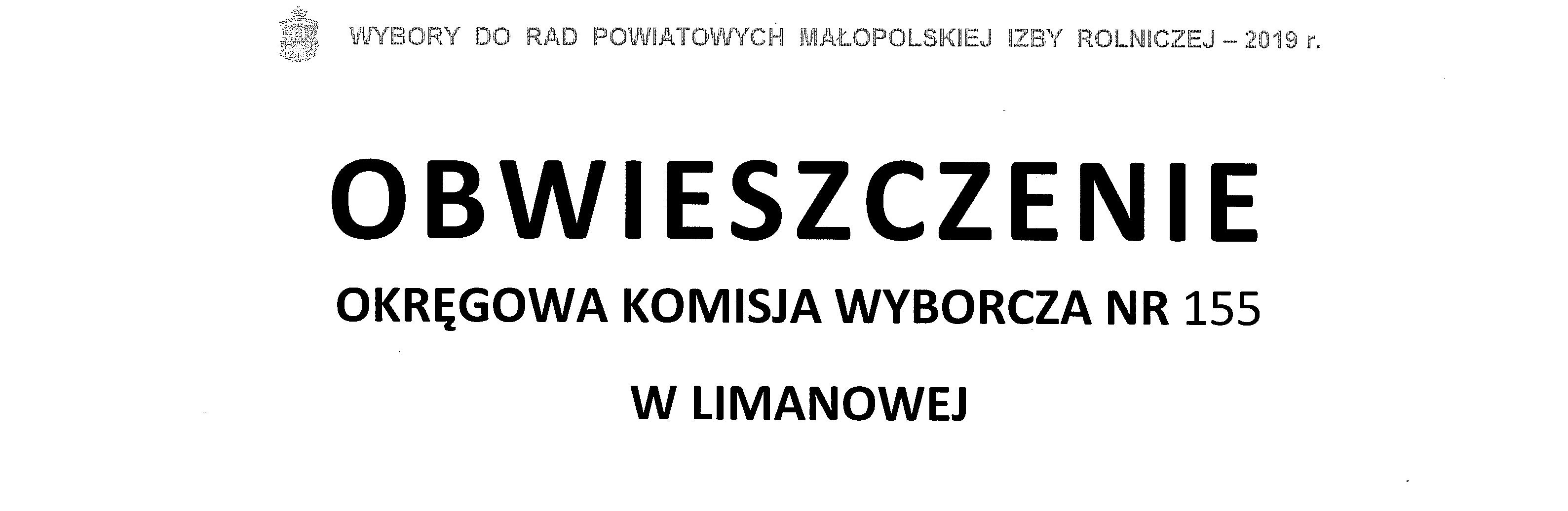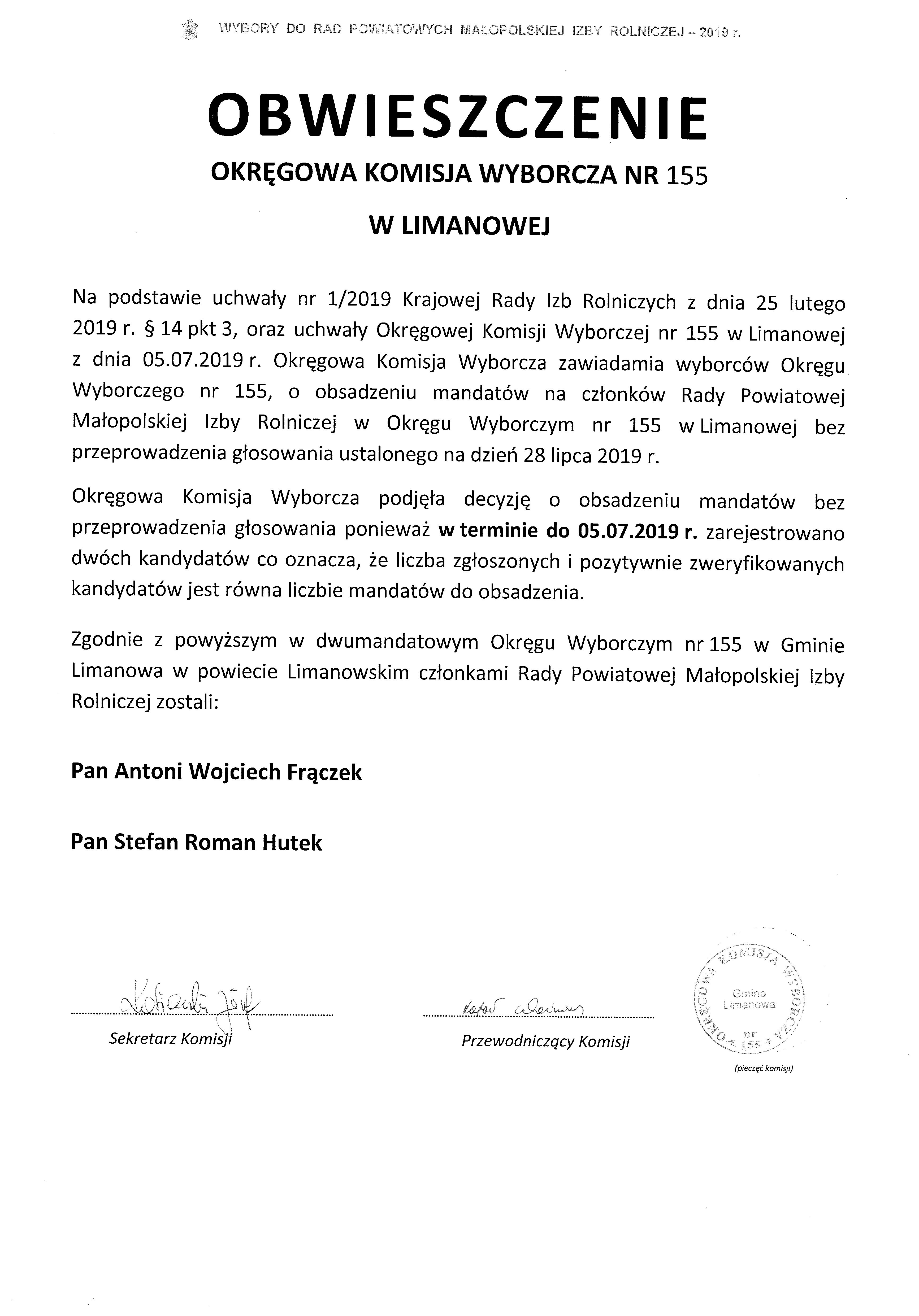Okręgowa Komisja Wyborcza  nr 155 w Limanowej  podaje do publicznej wiadomości  protokół rejestracji kandydatów, protokół w sprawie uznania zarejestrowanych kandydatów oraz obsadzenia mandatów do Rady Powiatowej Małopolskiej Izby Rolniczej bez głosowania. Decyzja ta wynika z faktu, iż do dnia 05.07.2019 r. zarejestrowano dwóch kandydatów, co oznacza że liczba zgłoszonych i pozytywnie zweryfikowanych kandydatów była równa liczbie mandatów do obsadzenia.