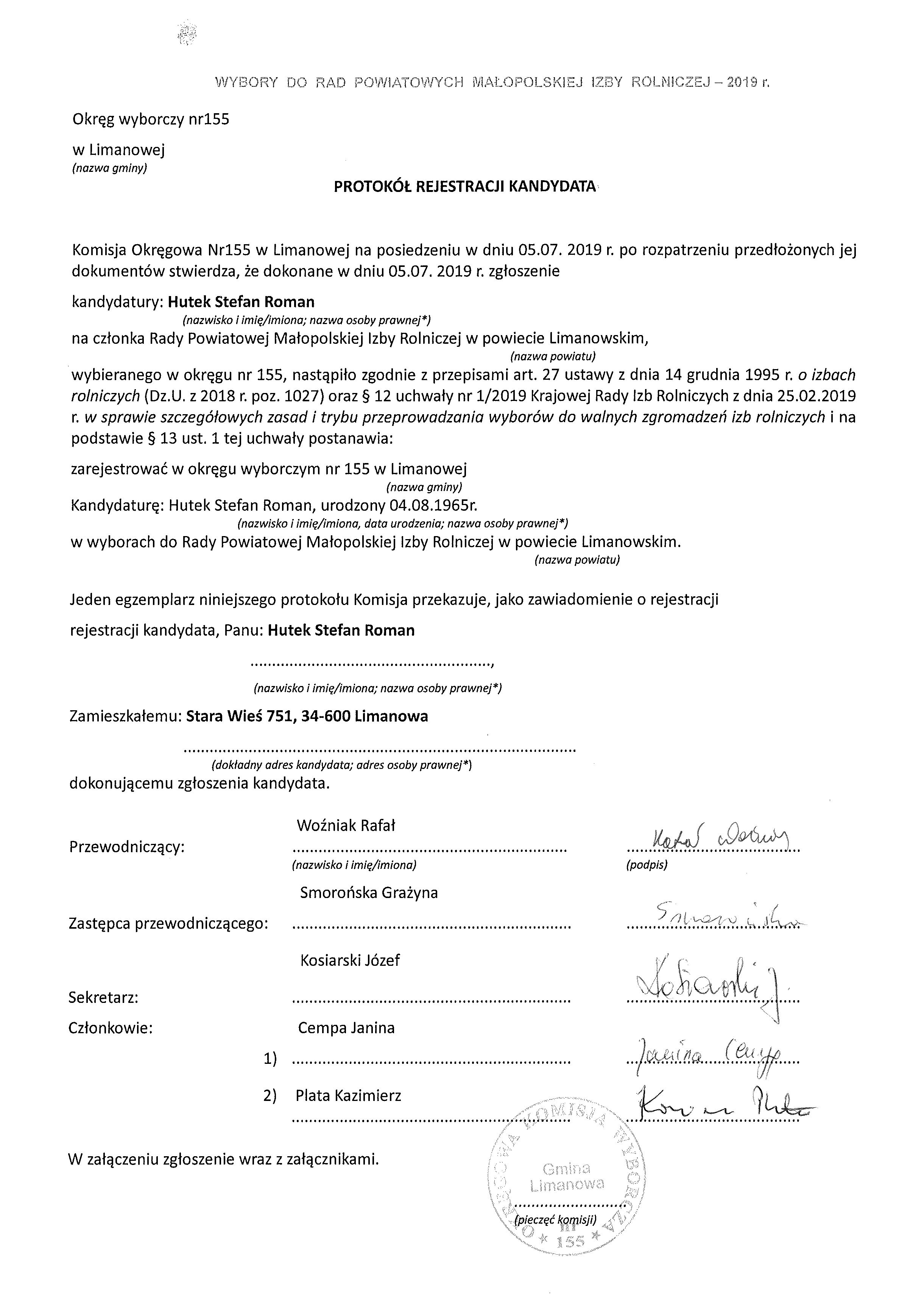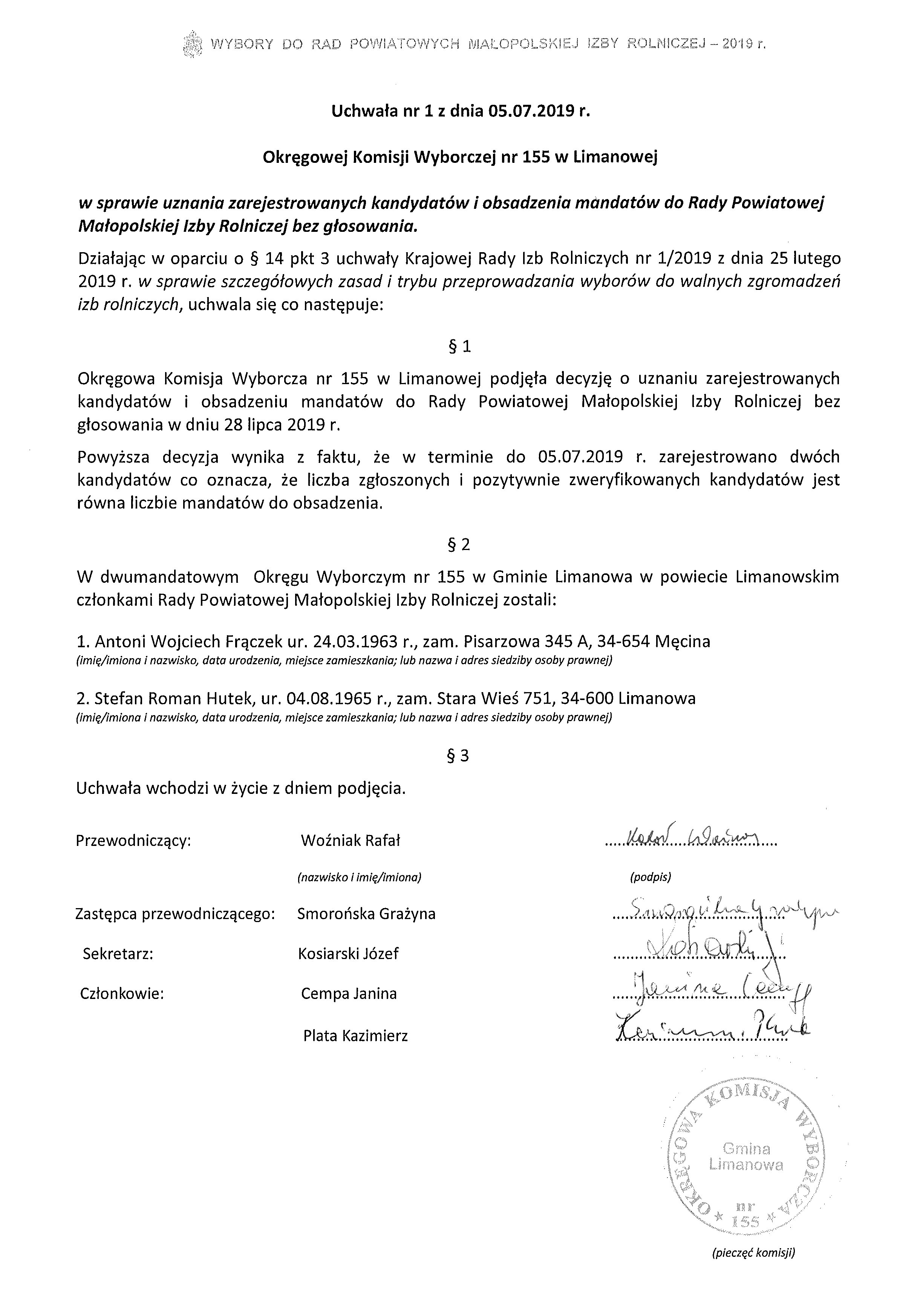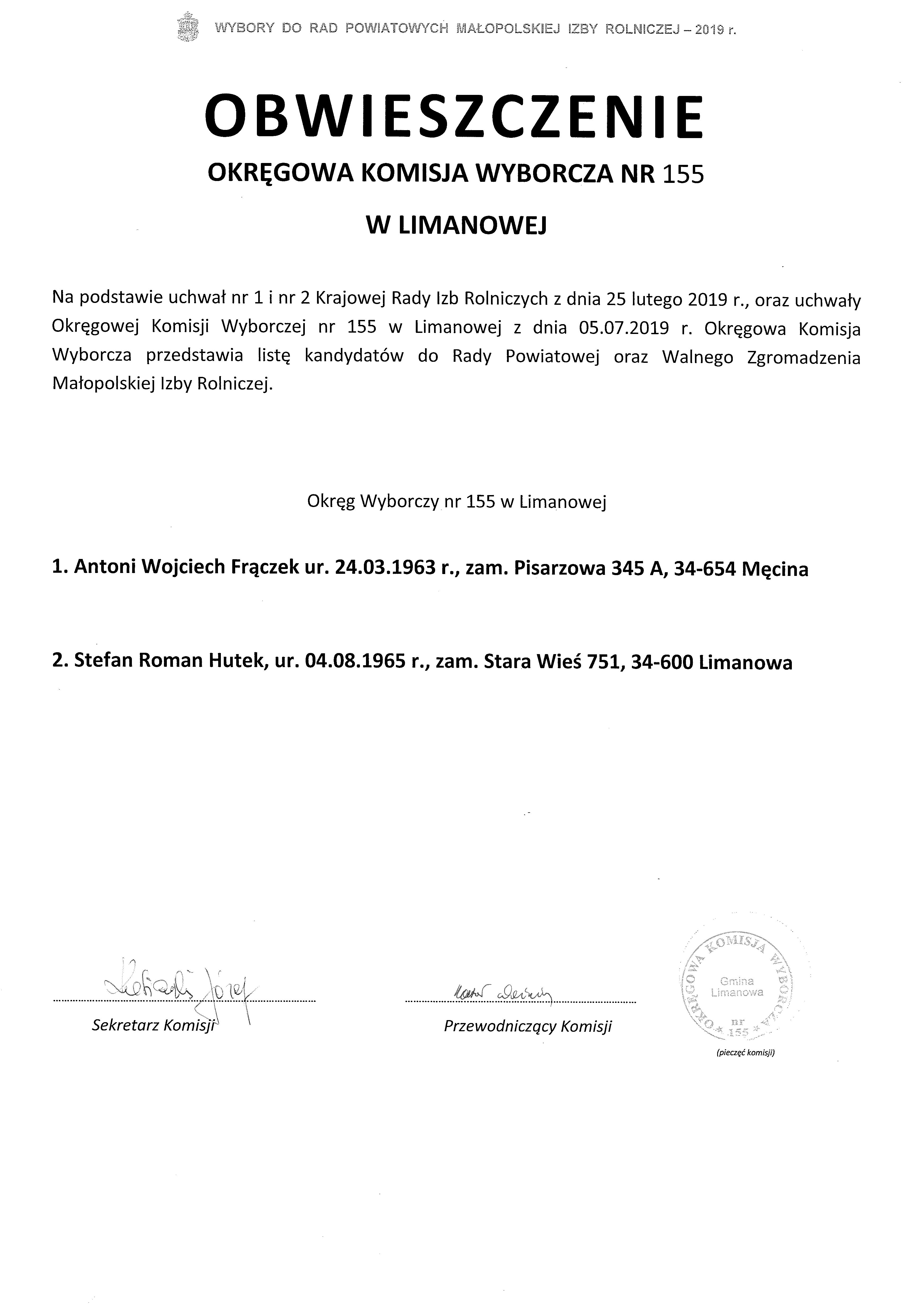 Okręgowa Komisja Wyborcza  nr 155 w Limanowej  podaje do publicznej wiadomości  protokół rejestracji kandydatów, protokół w sprawie uznania zarejestrowanych kandydatów oraz obsadzenia mandatów do Rady Powiatowej Małopolskiej Izby Rolniczej bez głosowania. Decyzja ta wynika z faktu, iż do dnia 05.07.2019 r. zarejestrowano dwóch kandydatów, co oznacza że liczba zgłoszonych i pozytywnie zweryfikowanych kandydatów była równa liczbie mandatów do obsadzenia.
