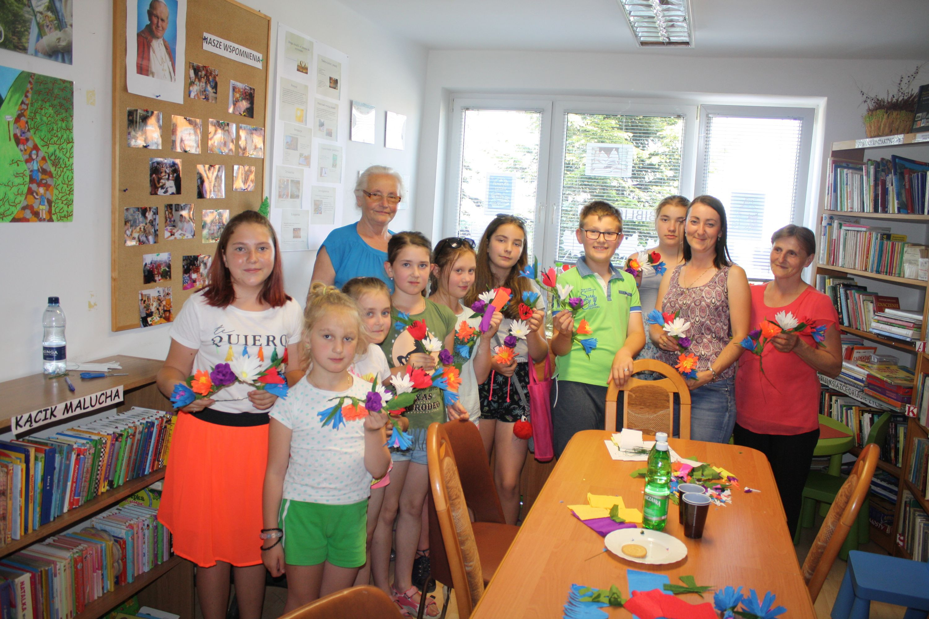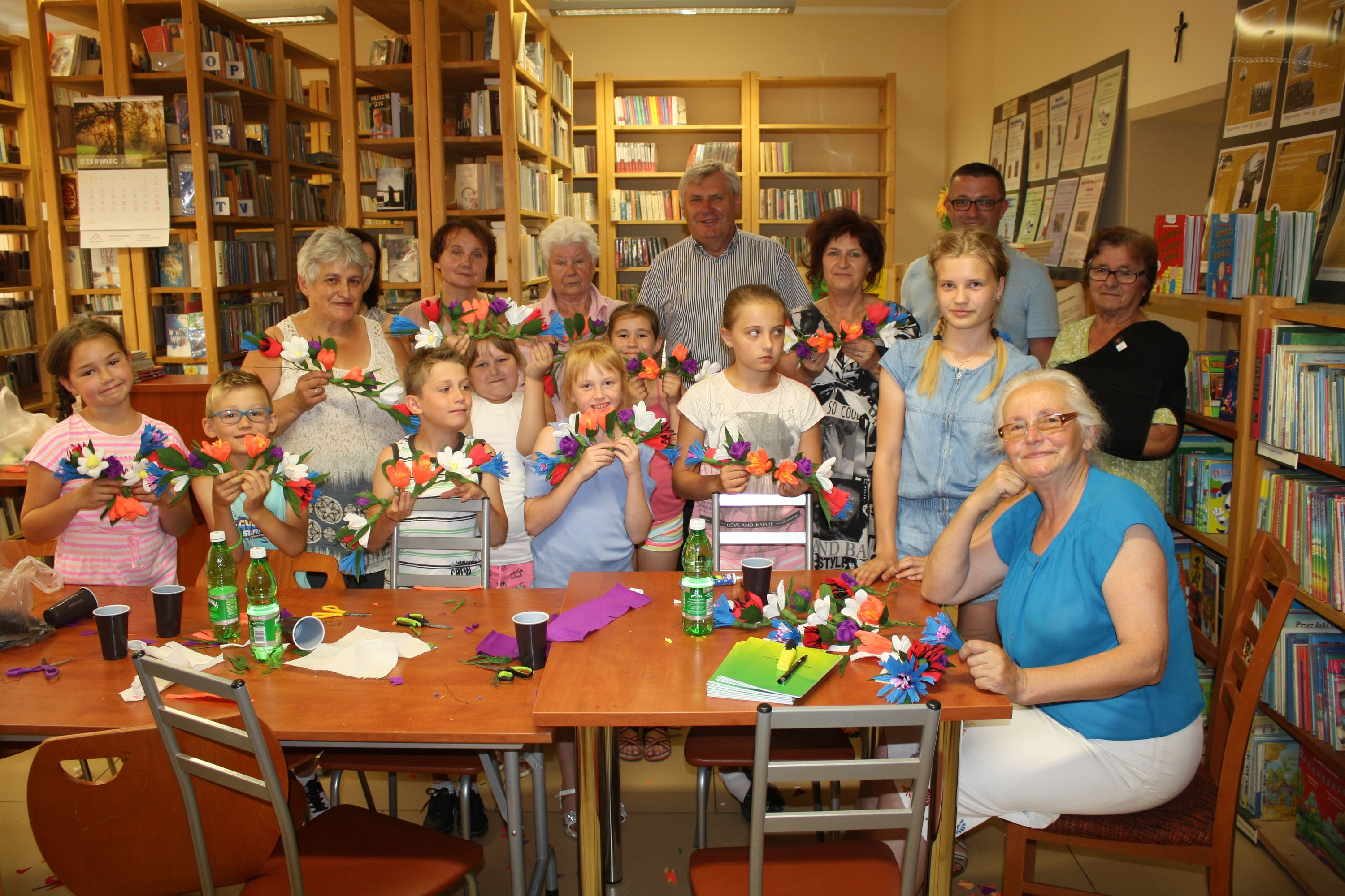 To dekoracyjne roślinne ornaty w formie podwieszanej wiązanki kwiatów liści i owoców oraz wykonane z bibuły kwiaty, które wykonywane były przez naszych dziadków i ojców po to, aby ozdabiały święte obrazy w naszych domach. Wszyscy uczestnicy byli pod ogromnym wrażeniem wiedzy i talentu męcińskiej artystki, a poszerzana wiedza przez czytanie bibliotekarzy informacji na ten temat była ważnym elementem spotkań warsztatowych zgodnie z hasłem tegorocznych wakacji naszej biblioteki „Najbliżsi czytają dzieciom”.
