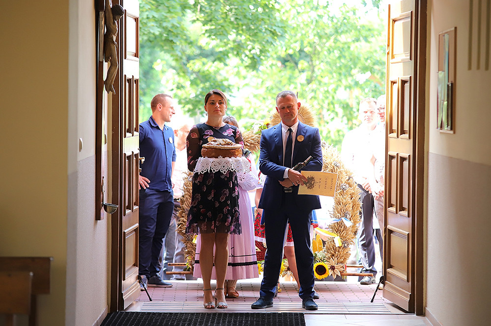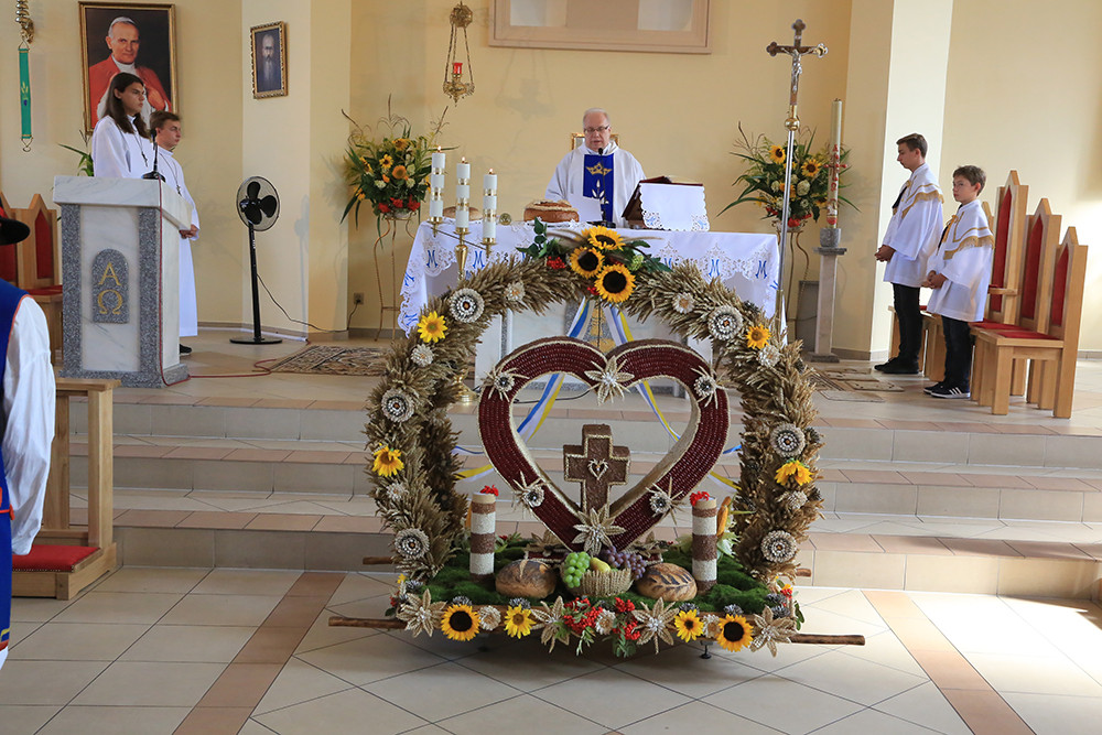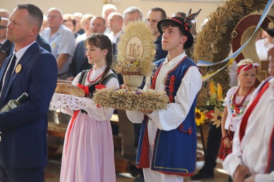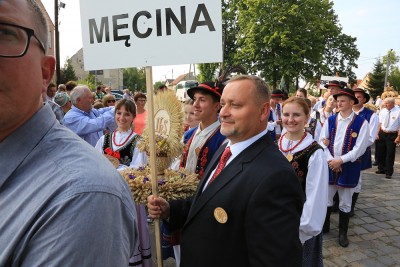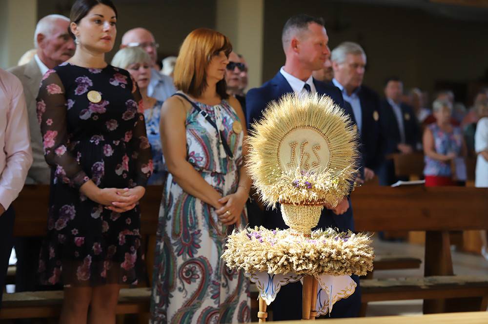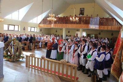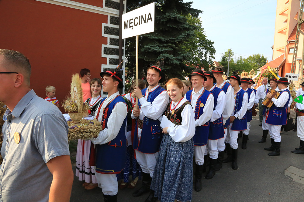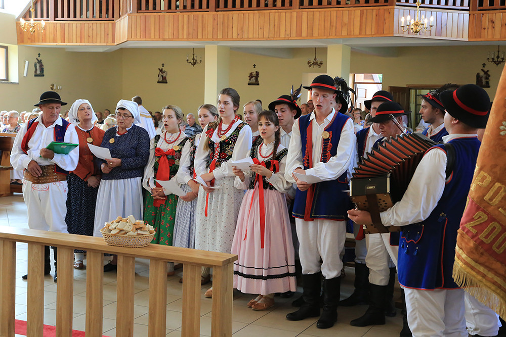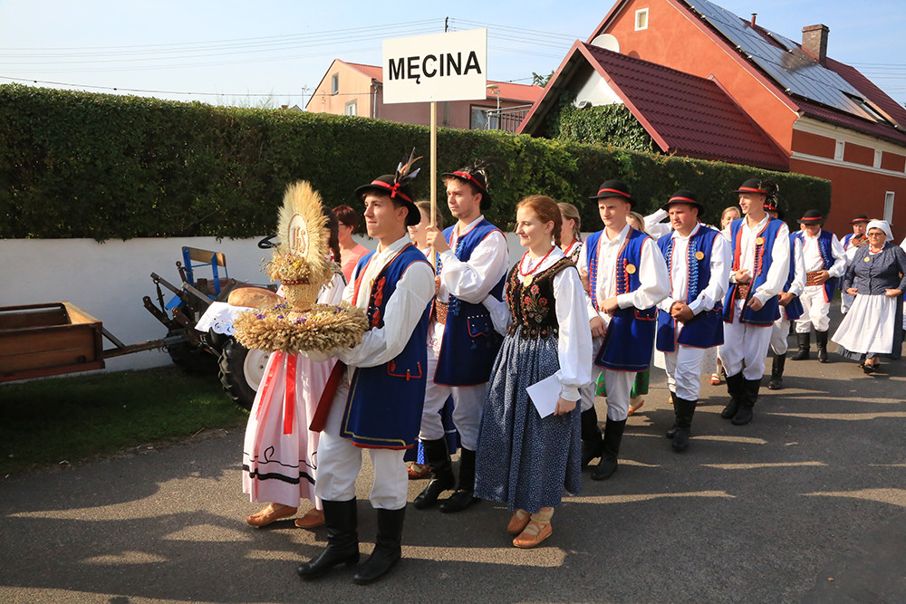 Wraz z orkiestrą dętą z Domaniowa, chórem Cantate Domino zespół "Spod Kicek" zapewnił oprawę muzyczną mszy świętej, która odprawiona została w miejscowym kościele parafialnym. Po powitaniu wszystkich gości rozpoczęła się ceremonia dożynkowa przekazania tradycyjnego chleba dożynkowego wójtowi Andrzejowi Pulitowi przez starostów dożynek. Wójt podziękował wszystkim rolnikom i mieszkańcom gminy za wysiłek i ciężką pracę przy zbiorach. Swój winiec dożynkowy oraz regionalny wypiek męciński - chleb od państwa Piwowarów, przekazany został także przez delegację z gminy Limanowa.