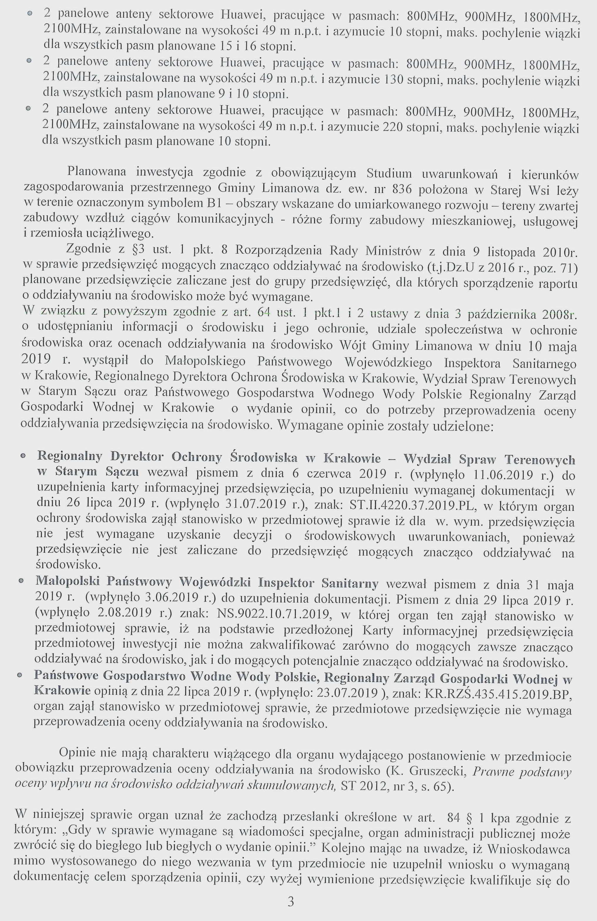 Wójt Gminy Limanowa, mając na uwadze dobro mieszkańców Starej Wsi, postanawia nałożyć na inwestora, którym jest T-Mobile Polska SA. obowiązek wykonania oceny oddziaływania na środowisko i opracowania raportu dla przedsięwzięcia określonego jako : " Budowa stacji bazowej telefonii komórkowej 55482 na terenie działki ew. nr 836 w miejscowości Stara Wieś".
