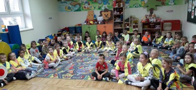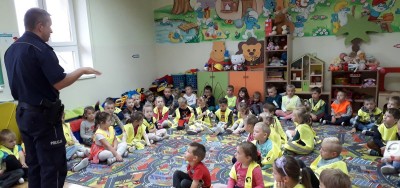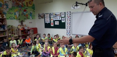 Podczas spotkania dzieci dowiedziały się jak należy prawidłowo przechodzić przez jezdnię, jak poruszać się po drodze, gdy nie ma chodnika, jak ważne jest zapinanie pasów podczas drogi „do” i „ze” szkoły samochodem oraz o obowiązkowym podróżowaniu w foteliku bezpieczeństwa. Dzieci wiedzą również jak ważne jest noszenie odblasków, by być bardziej widocznymi na drodze. Maluchy z uwagą słuchały wskazówek Pana Dariusza oraz chętnie zadawały pytania na temat pracy policji.