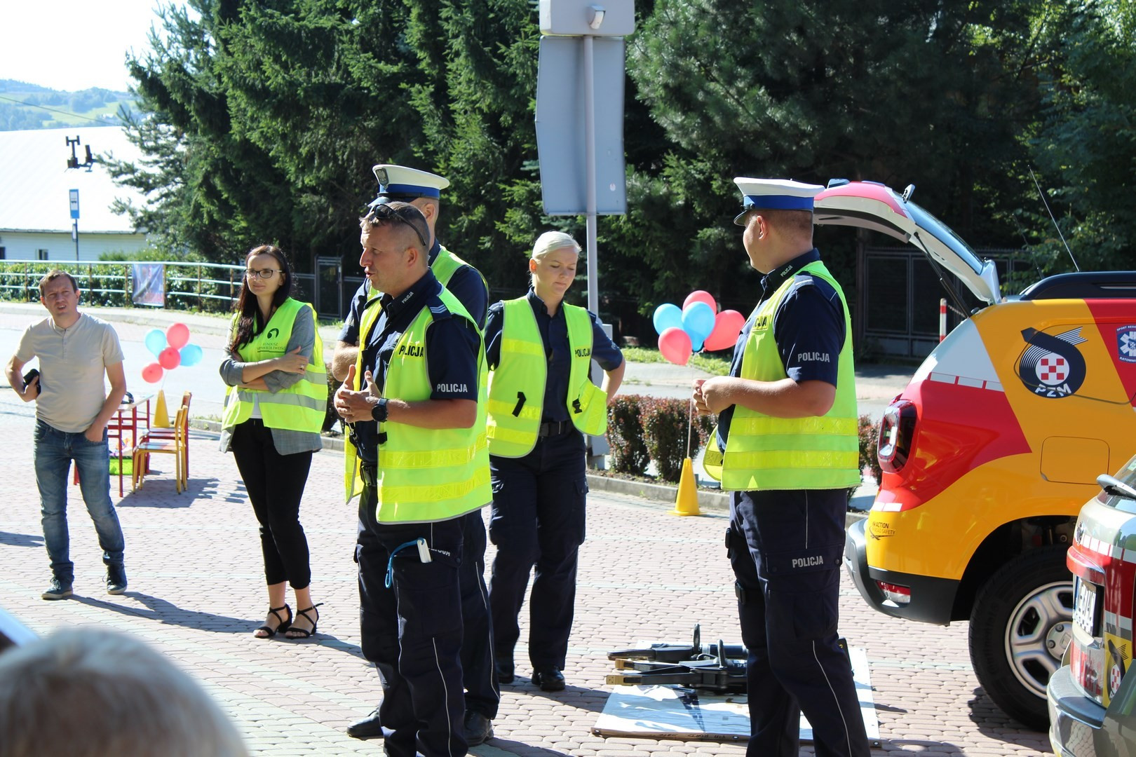 funkcjonariusze z Wydziału Ruchu Drogowego i Wydziału Prewencji Komendy Powiatowej Policji na czele z Rzecznikiem Komendanta Powiatowego Policji w Limanowej asp. Jolantą Mól oraz