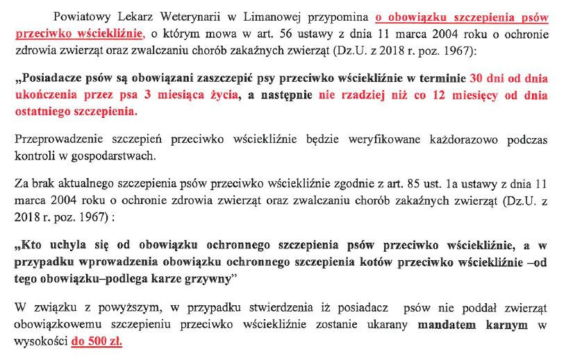 - pismo Powiatowego Lekarza Weterynarii o obowiązku szczepienia psów