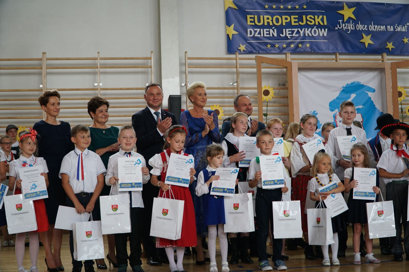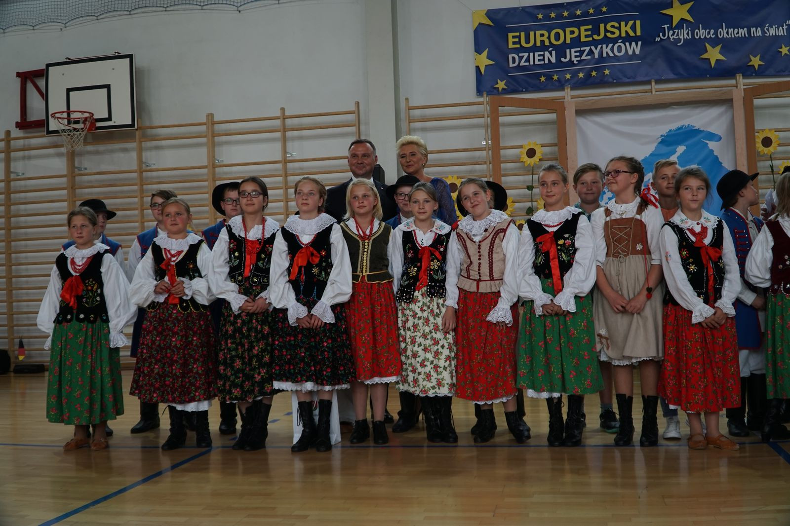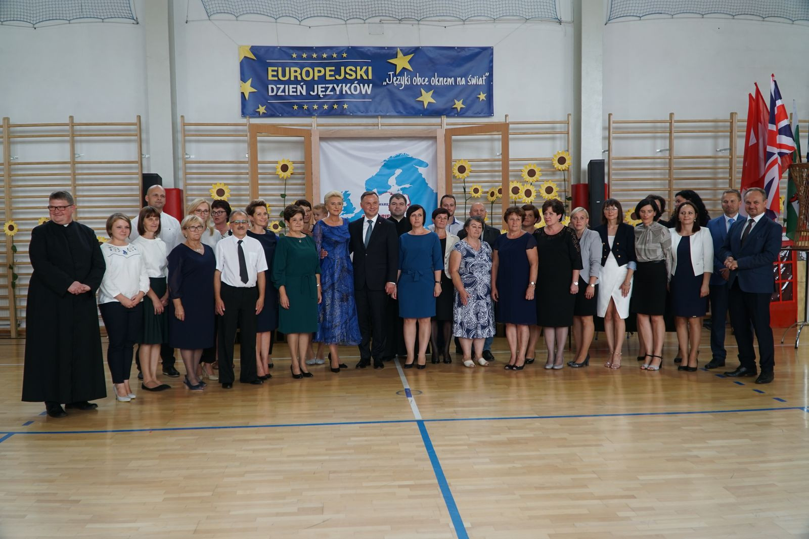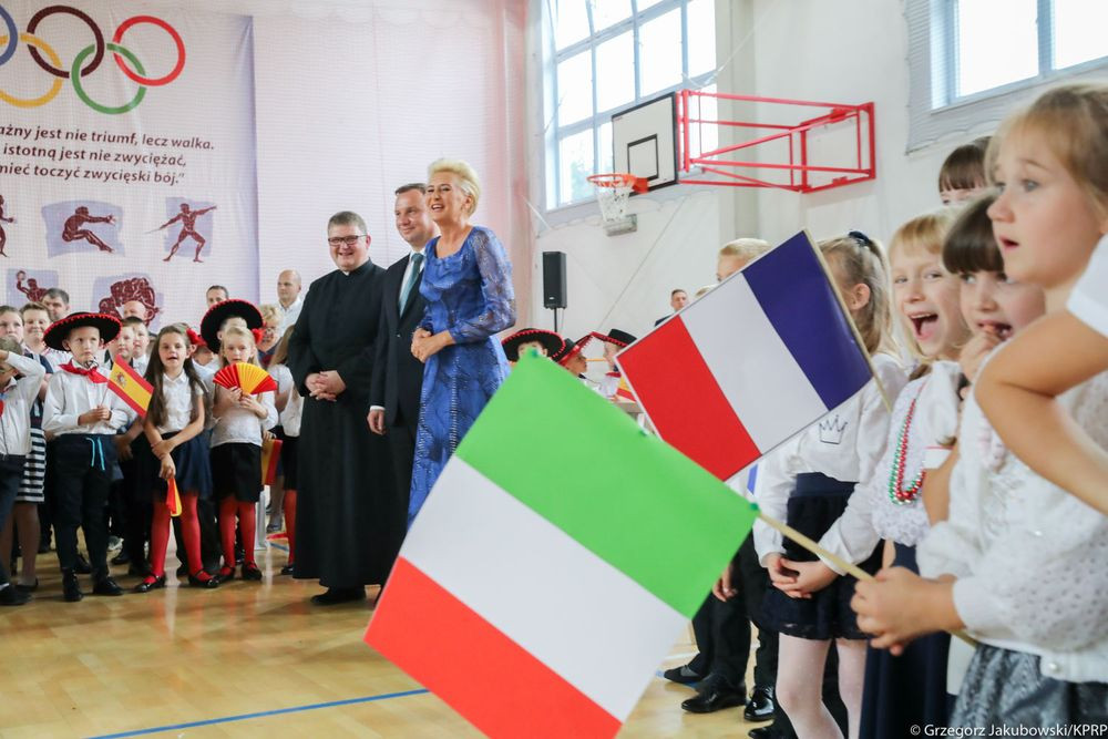 Spotkanie przybrało charakter wyjątkowej zabawy językami obcymi. Cała społeczność szkolna od najmłodszych oddziałów przedszkolnych po klasę ósmą, wraz z nauczycielami i zaproszonymi gośćmi włączyła się do programu uroczystości poprzez zabawę ruchową i śpiew. Atmosfera była nad wyraz serdeczna, dominowało uczucie radości ze spotkania. W trakcie uroczystości miał miejsce jeden moment kulminacyjny, który na długo zapadnie w pamięci wszystkim uczestnikom spotkania. Otóż w drzwiach hali sportowej, gdzie odbywała się akademia stanął Prezydent Rzeczypospolitej Polski Andrzej Duda. Wszyscy obecni zamarli ze zdumienia. Doprawdy nikt nie spodziewał się takiego obrotu sprawy, nawet sami organizatorzy. Chociaż scenariusz nie uwzględniał takiego punktu programu Dyrekcja Szkoły szybko opanowała sytuację i spontanicznie w sposób oficjalny w imieniu wszystkich powitała Głowę Państwa. Nastąpiła szybka wymiana pozdrowień, a serdecznościom nie było końca.