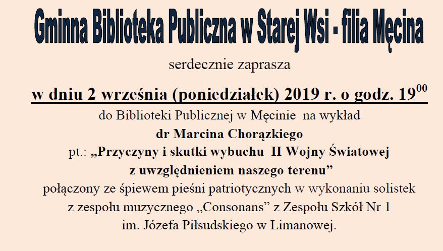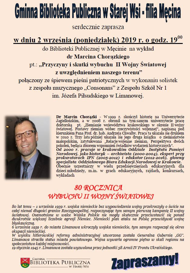 Gminna Biblioteka Publiczna w Starej Wsi serdecznie zaprasza w dniu 2 września (poniedziałek) 2019 r. o godz. 1900  do Biblioteki Publicznej w Męcinie  na wykład dr Marcina Chorązkiego