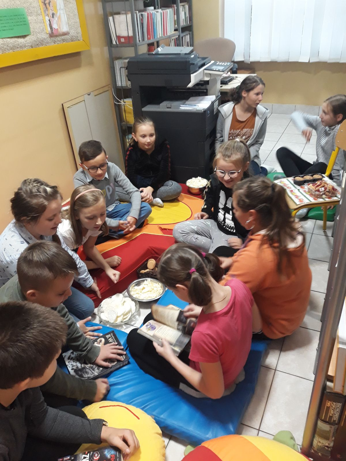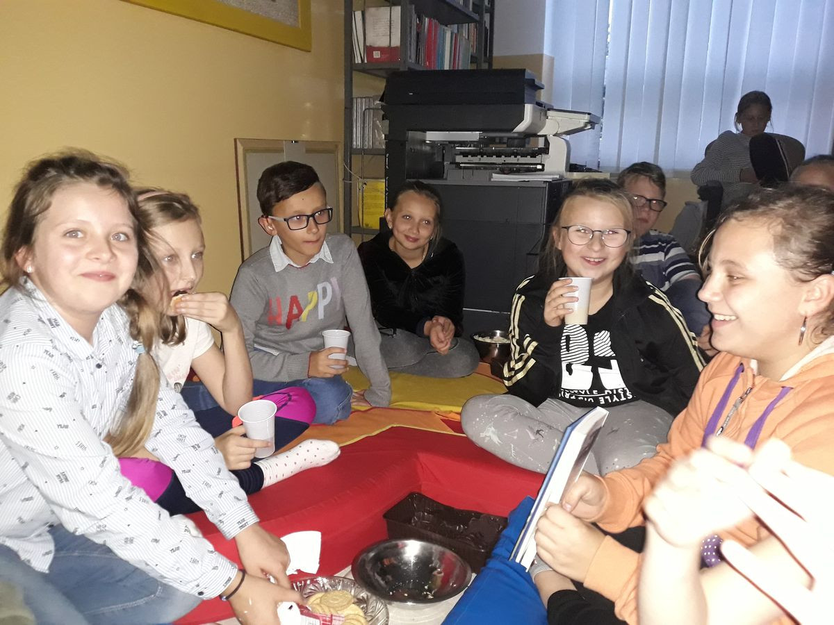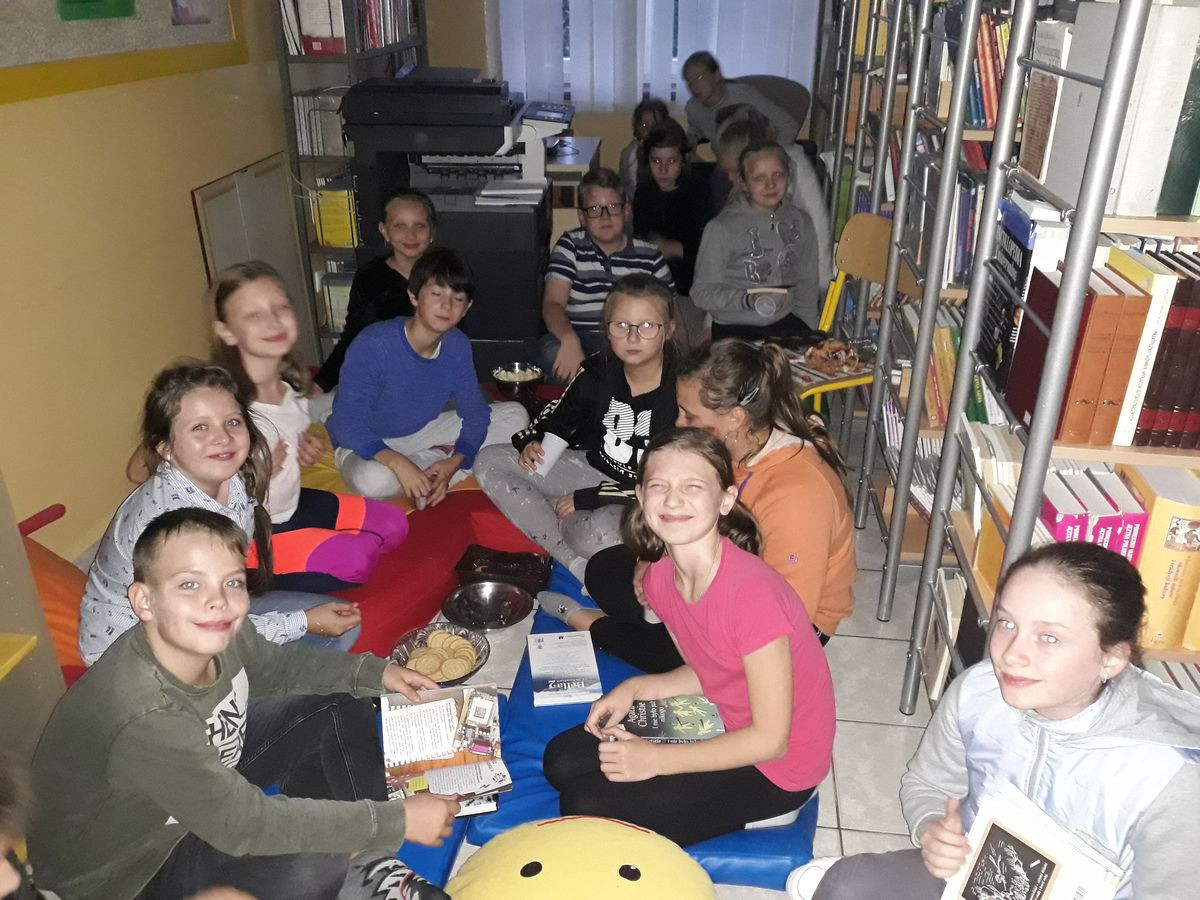 Spotkanie, które odbyło się 3 października w godzinach wieczornych, kierowane było do uczniów klas od 4 do 8. Uczestnicy przynieśli ze sobą ulubione książki. Każdy miał możliwość zaprezentowania wybranego tytułu, zachęcając pozostałych do sięgnięcia po daną pozycję. Podczas ponad godzinnej dyskusji okazało się, że wśród przedstawionych utworów znajdują się takie, po które sięgają wszyscy, niezależnie od wieku i preferencji czytelniczych. Szczególny nastrój spotkania podkreślał lampion oświetlający spowitą mrokiem bibliotekę. Niekończące się rozmowy o ulubionych książkach upływały w miłej atmosferze osłodzonej smakowitymi przekąskami.