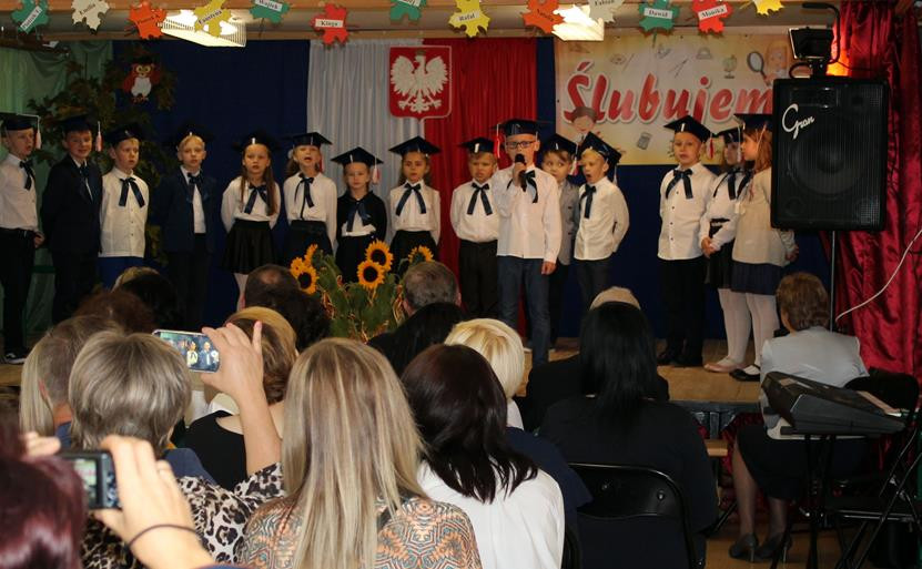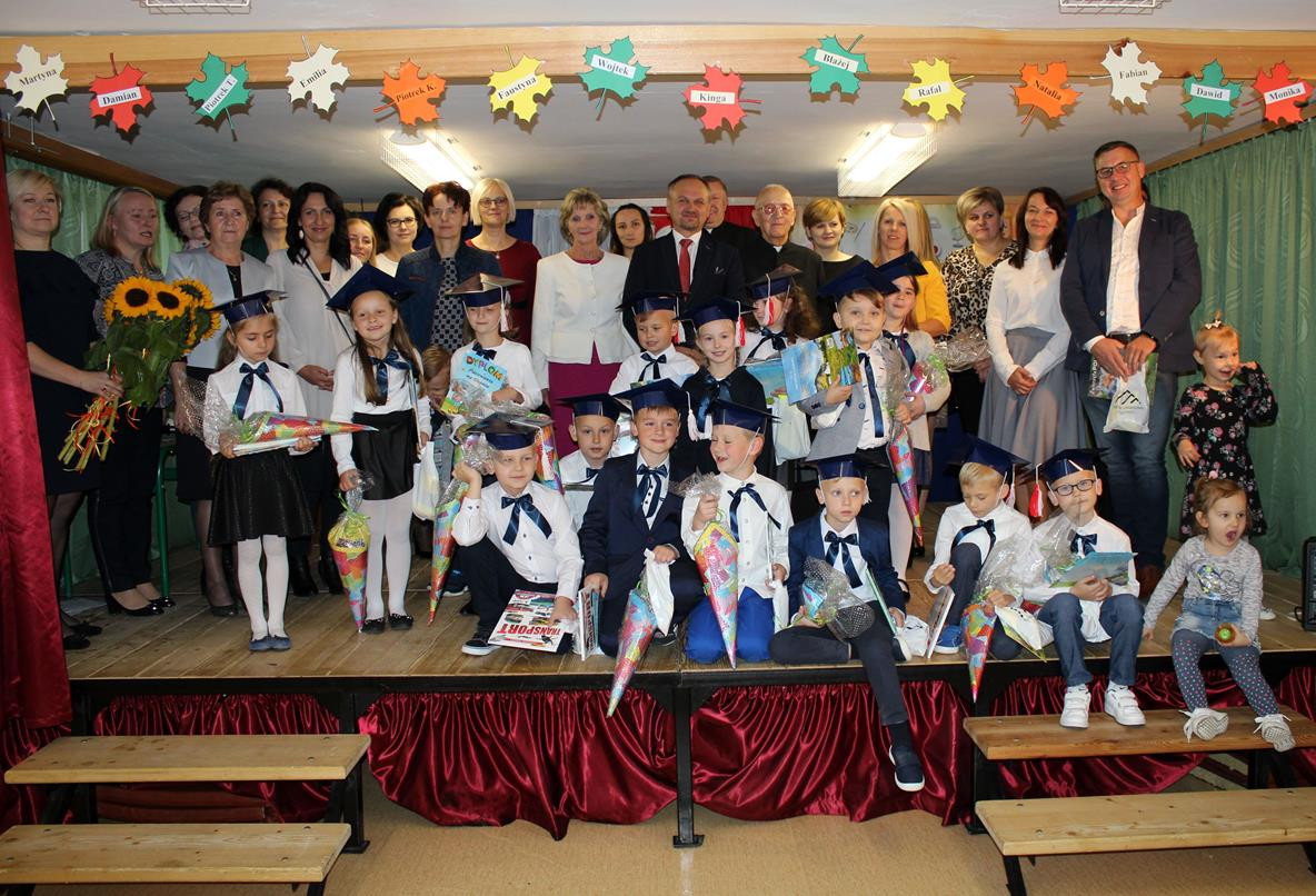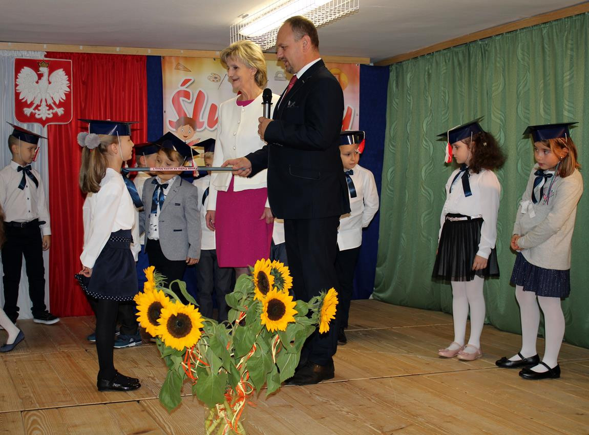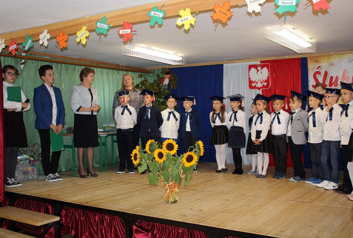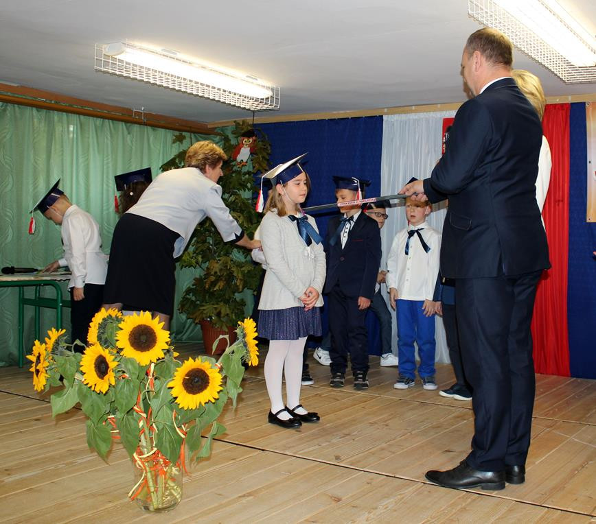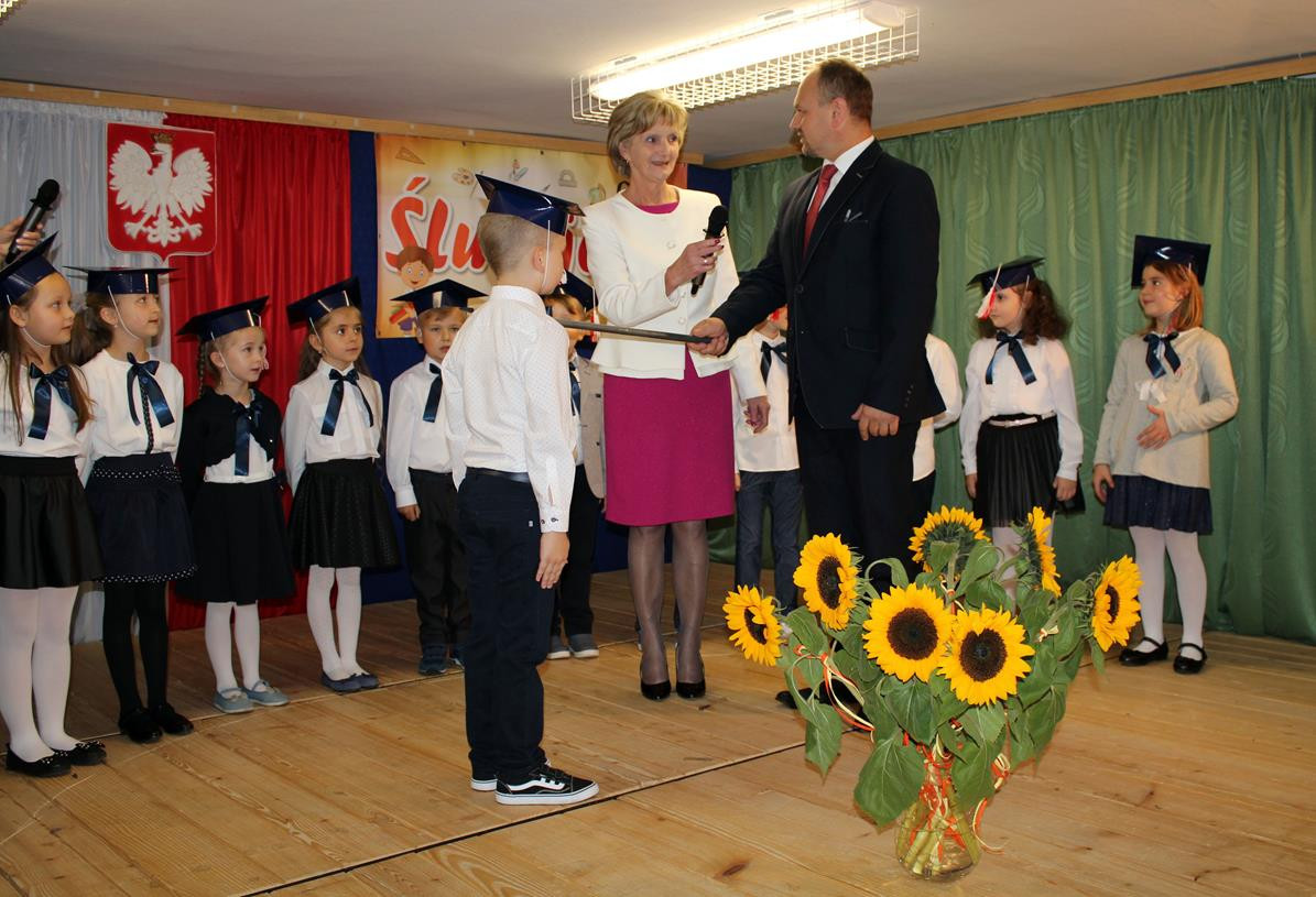 Na okoliczność pasowania odświętnie ubrani uczniowie pierwszych klas wraz z wychowawczyniami przygotowali specjalny program artystyczny i z wielkim przejęciem wystąpili przed rodzicami oraz nauczycielami. Występom z podziwem przyglądała się również zaproszona na uroczystość Dyrektor Gminnego Zespołu Obsługi Szkół Edyta Król, która wręczyła najmłodszym odblaskowe upominki, by zapewniały najmłodszym uczniom bezpieczeństwo w drodze ze szkoły.