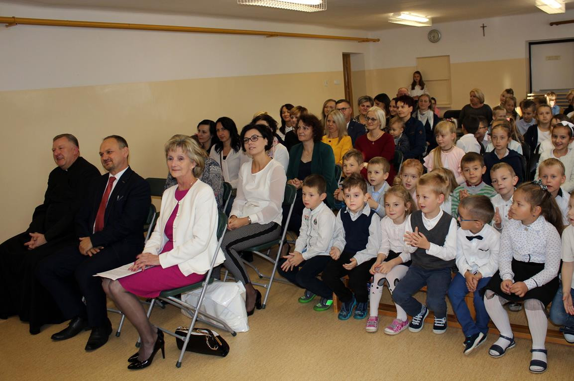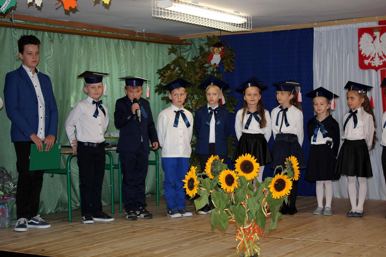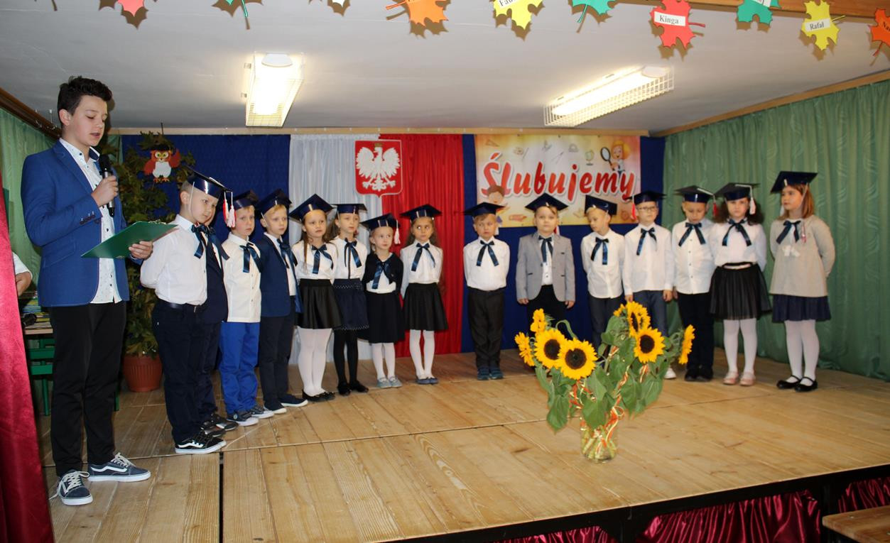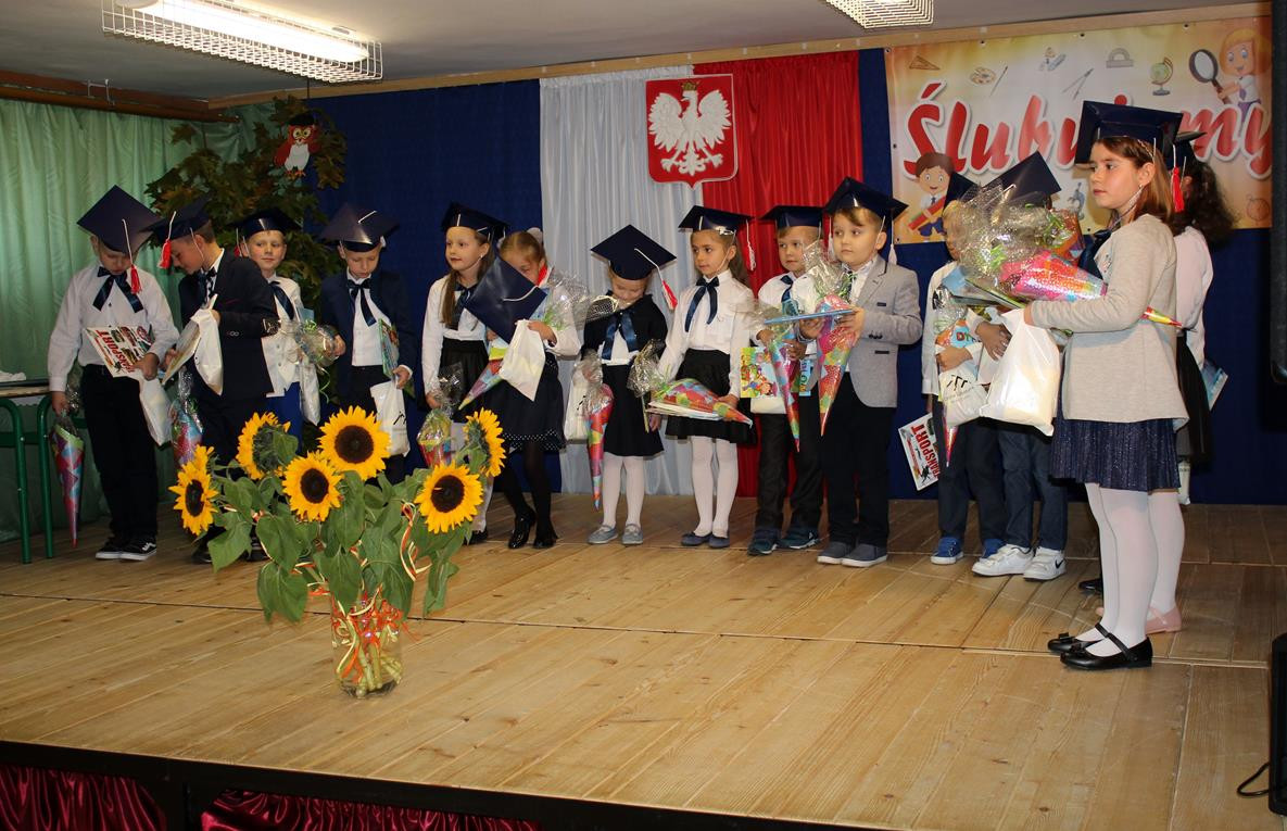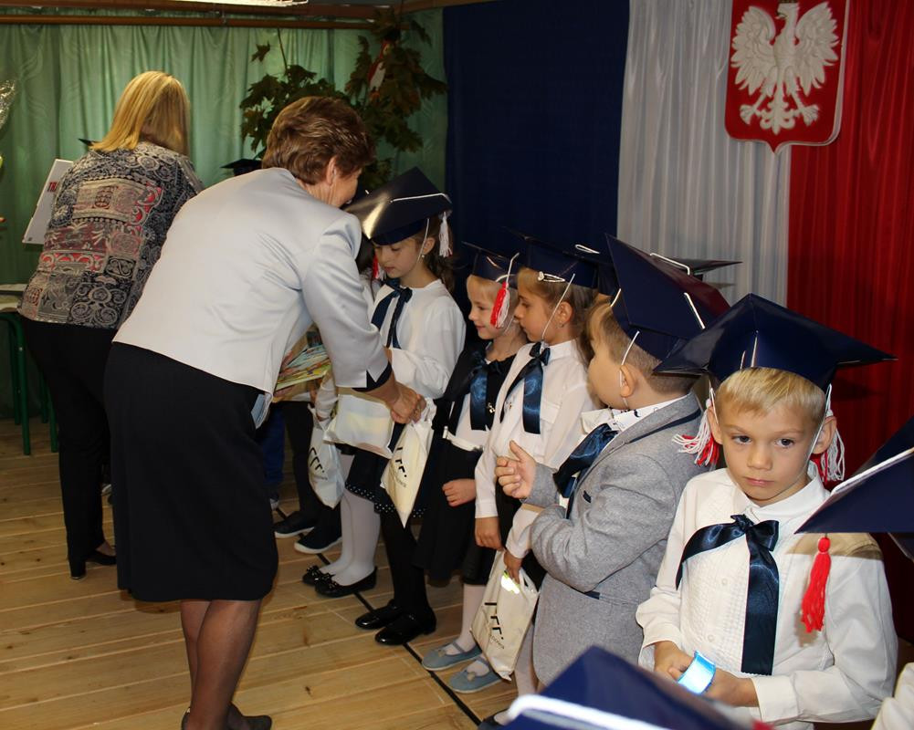 Na okoliczność pasowania odświętnie ubrani uczniowie pierwszych klas wraz z wychowawczyniami przygotowali specjalny program artystyczny i z wielkim przejęciem wystąpili przed rodzicami oraz nauczycielami. Występom z podziwem przyglądała się również zaproszona na uroczystość Dyrektor Gminnego Zespołu Obsługi Szkół Edyta Król, która wręczyła najmłodszym odblaskowe upominki, by zapewniały najmłodszym uczniom bezpieczeństwo w drodze ze szkoły.