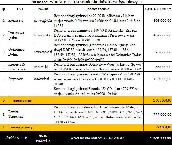 W dniu 25 października do 6 jednostek samorządu terytorialnego z terenu woj. małopolskiego, w ramach promes ministerialnych na usuwanie skutków klęsk żywiołowych trafiło łącznie 1.828.000,00 zł, za które wykonanych zostanie 7 zadań drogowych.