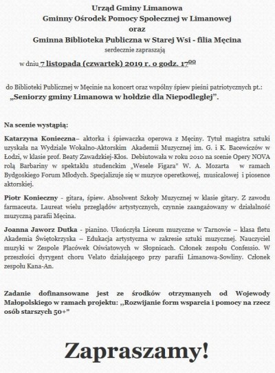 Urząd Gminy Limanowa, Gminny Ośrodek Pomocy Społecznej oraz Gminna Biblioteka Publiczna w Starej Wsi zapraszają w dniu 7 listopada (czwartek) 2019 r. o godz. 17.00 do Biblioteki Publicznej w Męcinie na koncert oraz wspólny śpiew pieśni patriotycznych pt.: „ Seniorzy gminy Limanowa w hołdzie dla Niepodległej”.
