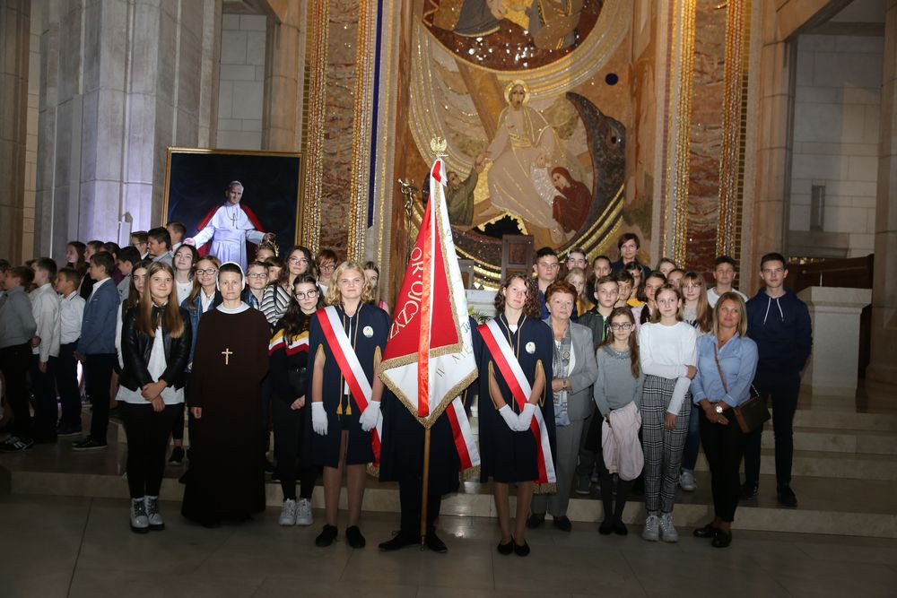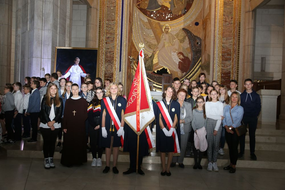 Dnia 16 października 2019 roku, dokładnie w dniu 41. rocznicy wyboru Karola Wojtyły na Stolicę Piotrową, przedstawiciele Szkoły Podstawowej nr 1 w Męcinie wzięli udział w III Pielgrzymce Szkół imienia Jana Pawła II. Spotkanie miało miejsce w Sanktuarium św. Jana Pawła II w Krakowie. Delegacja uczniów na czele z Dyrektor Marią Lupą, Renatą Długosz, ks. proboszczem Antonim Pisiem, siostrą katechetką oraz wychowawcami uczestniczyła w uroczystej Mszy św.