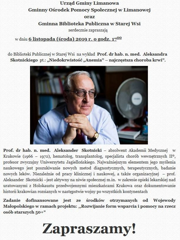 Urząd Gminy Limanowa, Gminny Ośrodek Pomocy Społecznej oraz Gminna Biblioteka Publiczna w Starej Wsi zapraszają w dniu 6 listopada (środa) 2019 r. o godz. 17.00 do siedziby biblioteki w Starej Wsi na wykład prof. dr hab. n. med. Aleksandra Skotnickiego pt.: „Niedokrwistość „Anemia” – najczęstsza choroba krwi”.
