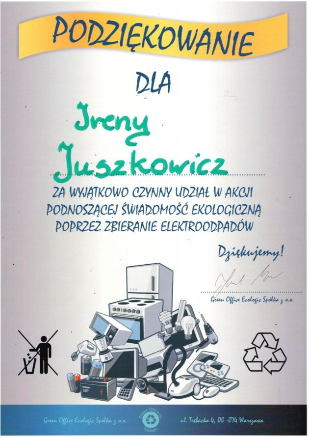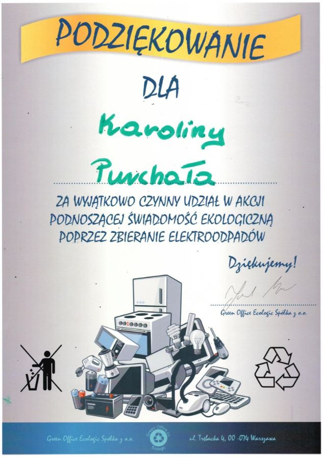 Elektośmieci o łącznej wadze 1350 kg zostały przekazane dnia 26 września. W ramach podziękowania za zaanagżowanie w akcję szkoła otrzymała bon na zakup sprzętu sportowego na kwotę 272 zł. Działania proekologiczne będą kontynuowane w kolejnych latach.