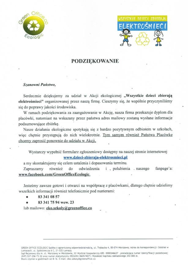W tym roku Szkoła Podstawowa w Starym Rybiu wzięła udział w akcji ekologicznej Wszystkie dzieci zbierają elektrośmieci organizowanej przez firmę Green Office Ecologic.