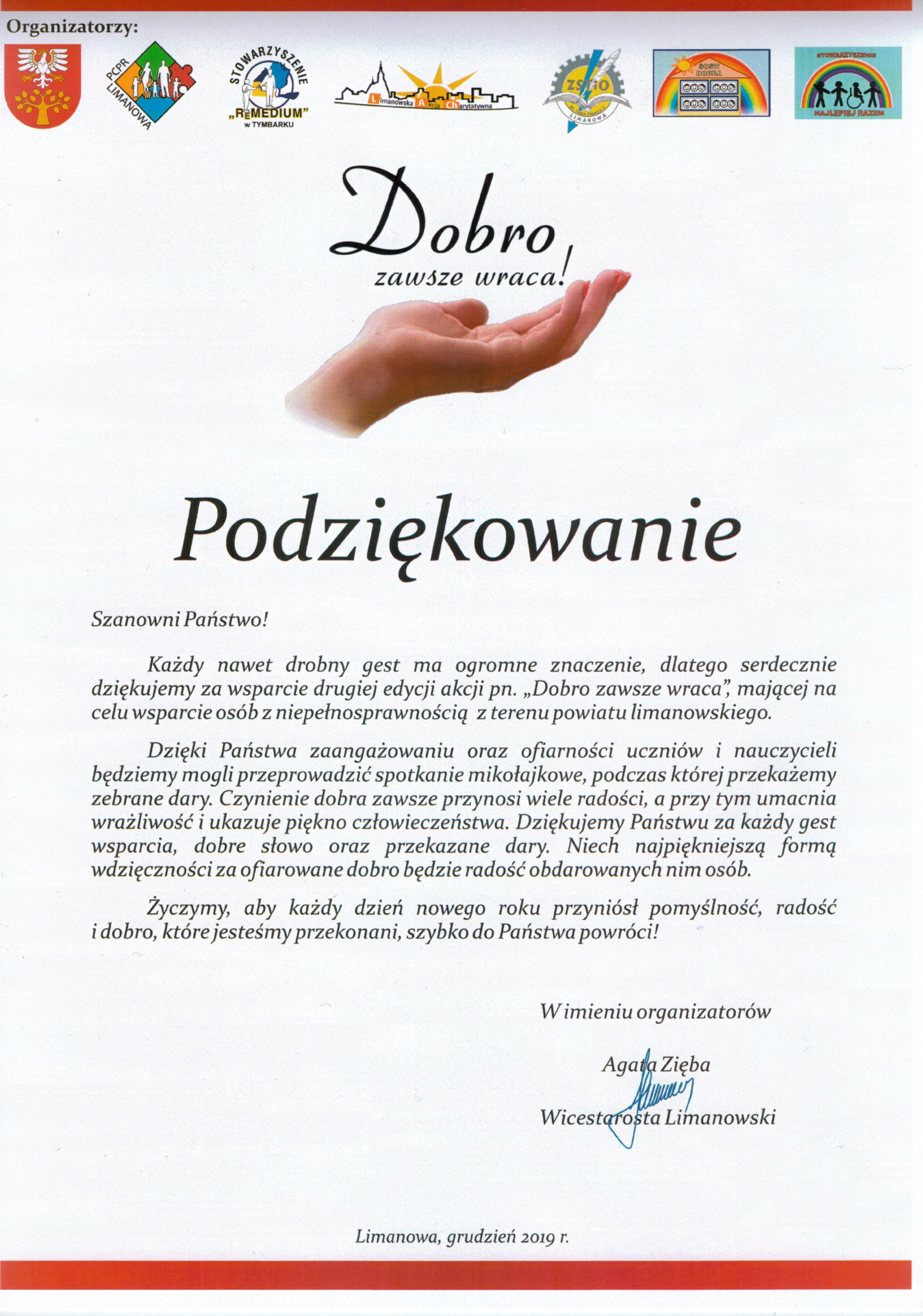 W dniu 25 listopada szkołę odwiedzili przedstawiciele instytucji będących organizatorami akcji, Teresa Zabramny - Prezes Limanowskiej Akcji Charytatywnej, Monika Nawalaniec – Dyrektor PCPR w Limanowej i Mateusz Pietrzak – Kierownik Biura Promocji, Kultury i Turystyki Starostwa Powiatowego w Limanowej. Wolontariuszki reprezentujące Szkolne Koło Caritas przekazały na ręce delegacji zebrane dary w postaci słodyczy oraz materiałów szkolnych i dekoracyjnych, a także środki finansowe w kwocie 1.913,37 zł.