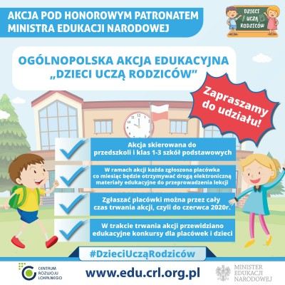 Centrum Rozwoju Lokalnego serdecznie zaprasza wszystkie przedszkola i klasy 1-3 szkół podstawowych do udziału w objętej honorowym patronatem Ministra Edukacji Narodowej ogólnopolskiej, trwającej do końca roku szkolnego 2019/2020 akcji edukacyjnej pn. "Dzieci uczą rodziców". Celem akcji wsparcie procesu edukacji najmłodszych, a także zachęcenie ich do rozmowy z rodzicami na tematy będące przedmiotem lekcji przeprowadzonych podczas akcji "Dzieci uczą rodziców".