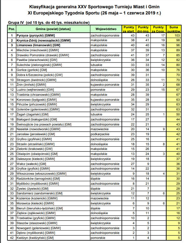 Gmina Limanowa , w IV grupie gmin od 15 do 40 tys. mieszkańców zajęła