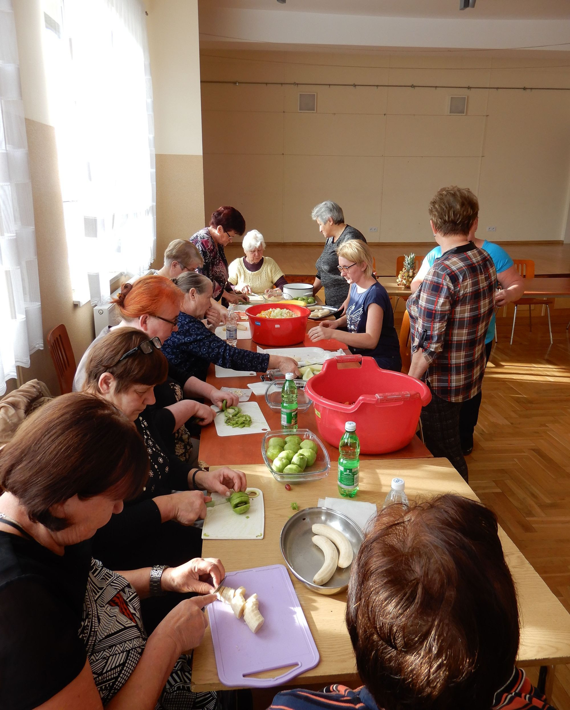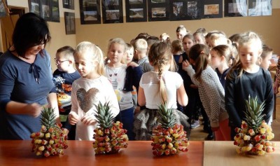 Zgromadzona ekipa żwawo zabrała się do robienia sałatki. Banany, mango, awokado, mandarynki, winogrona, pomarańcze, ananasy, brzoskwinie, kaki tylko migały w wprawnych rękach pań gospodyń. Dzieci z zainteresowaniem przyglądały się całemu procesowi, chłonąc kulinarne umiejętności. Lidia Chwastek-Biedroń oraz Lidia Kazior zapoznały dzieci z korzyściami płynącymi z jedzenia owoców. Potem przyszedł czas na zagadki, w czasie których została sprawdzona utrwalona wiedza dzieci na temat zdrowej żywności. Autorem zagadek była bibliotekarka Lidia Piegza. Dzieci miały też okazję zapoznać się z prezentowanymi poradnikami kulinarnymi jak również z książką "Wesoła kuchnia. Wierszyki dla dzieci" Elżbiety Śnieżkowskiej-Bielak, fragmenty której zostały przez uczestników spotkania głośno odczytane.