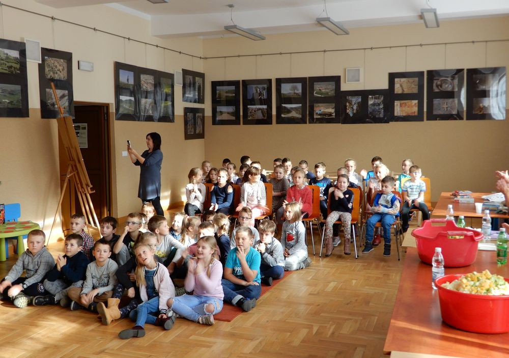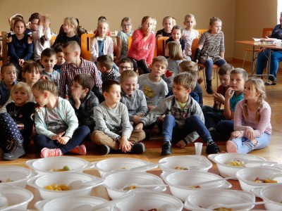 Na końcu wszyscy skosztowali sałatkowej uczty smaków. Zadowolone miny 48 dzieci mówiły wszystko. Sałatka topniała w zastraszającym tempie. Po kulinarnych warsztatach i wzmocnieniu ciała, trzeba było wzmocnić ducha. W tym celu dzieci prześledziły księgozbiór biblioteki i każdy znalazł coś dla siebie. Dzieci miały okazję także zobaczyć wystawę