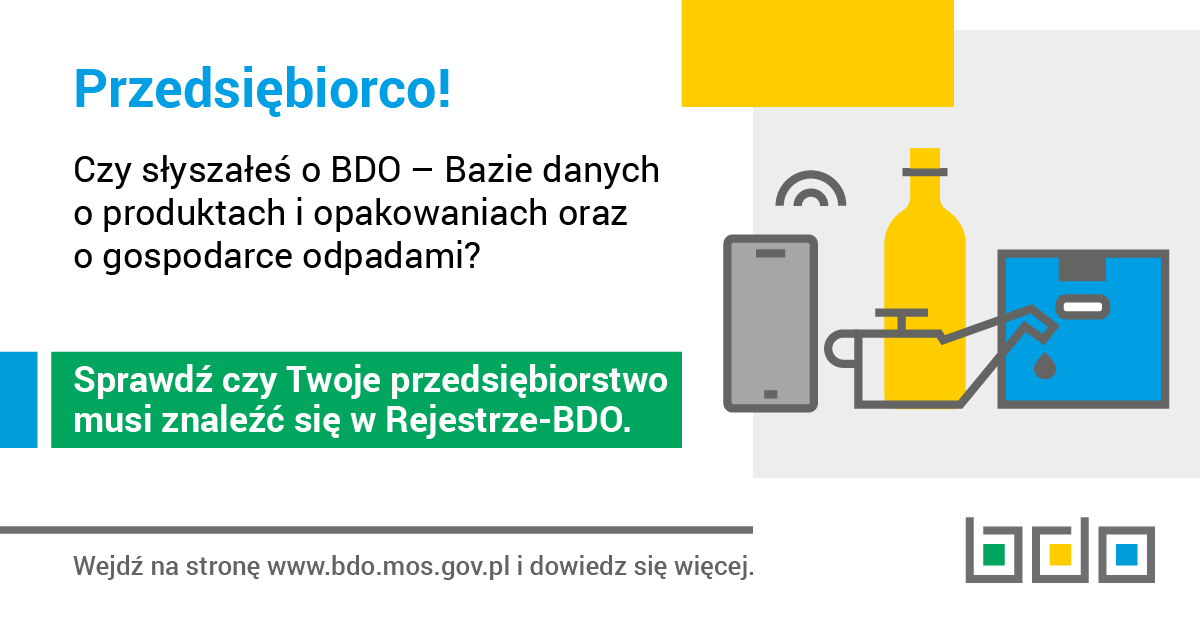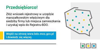 Podmioty, które wytwarzają odpady oraz prowadzą ewidencję odpadów oraz te które wprowadzają na terytorium Polski produkty w opakowaniach zobowiązane są do końca 2019 roku zarejestrować się w Bazie danych o produktach i opakowaniach oraz o gospodarce odpadami (BDO). Brak rejestracji w tym terminie powodować może trudności w prowadzeniu działalności w związku z kolejnymi modułami BDO, które wejdą w życie z dniem 1 stycznia 2020 r.