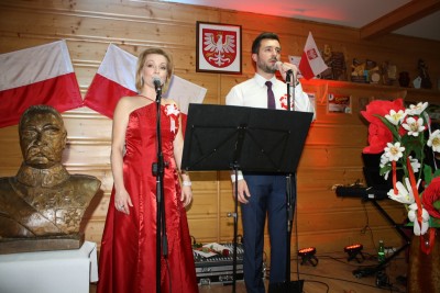 Występ rozpoczął się od wspólnego odśpiewania hymnu, następnie artyści zaprezentowali przygotowany patriotyczny spektakl słowno-muzyczny. Na ten koncert mieszkańcy Męciny czekali już od dawna i nie zawiedli się. Trzeba przyznać, że występujący na scenie duet Katarzyny i Piotra Koniecznych przy akompaniamencie Joanny Jaworz Dutki, grającej na pianinie oczarował zgromadzoną publiczność. Wojenne piosenki żołnierskie ,,O mój rozmarynie”, ,,Biały krzyż”, ,,Wojenko wojenko” wycisnęły niejedną łezkę w oku, a czytane fragmenty listów żołnierskich pozwalały wczuć się w tragiczne losy wojennych bohaterów, ich dramatyczne wybory i bolesne rozstania. Aksamitne brzmienie głosu Piotra idealnie współbrzmiało z operowym wręcz śpiewem Katarzyny. Po zakończonym występie, na prośbę słuchających, na ,,bis”, artyści zaśpiewali poruszającą pieśń: ,,Matko, o twarzy, jak polska ziemia, czarnej..”.