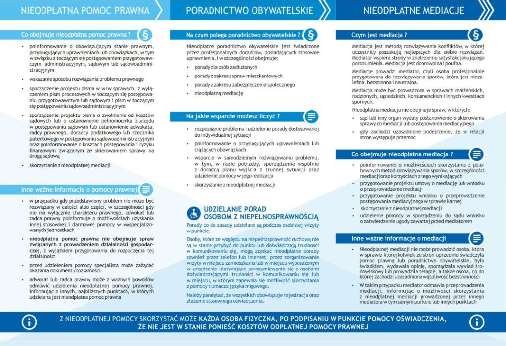 Dobra informacja jest taka, że zakres świadczonych porad prawnych jest dość szeroki i obejmuje m.in.: sprawy z zakresu prawa administracyjnego, rodzinnego, cywilnego, karnego, prawa pracy, ubezpieczeń społecznych, prawa podatkowego, spadkowego, rzeczowego, a także prawa do opieki zdrowotnej. Nieodpłatna pomoc nie obejmuje kwestii związanych z prowadzoną działalnością gospodarczą, za wyjątkiem przygotowania do jej rozpoczęcia.