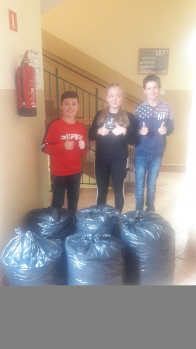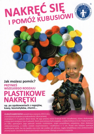 - Akcja nakrętkowa "Nakręć się i pomóż Kubusiowi"Przekazaliśmy rodzicom chłopca 5 worków zakrętek. Nasi uczniowie, w dalszym ciągu systematycznie zbierają plastikowe nakrętki dla Kubusia!