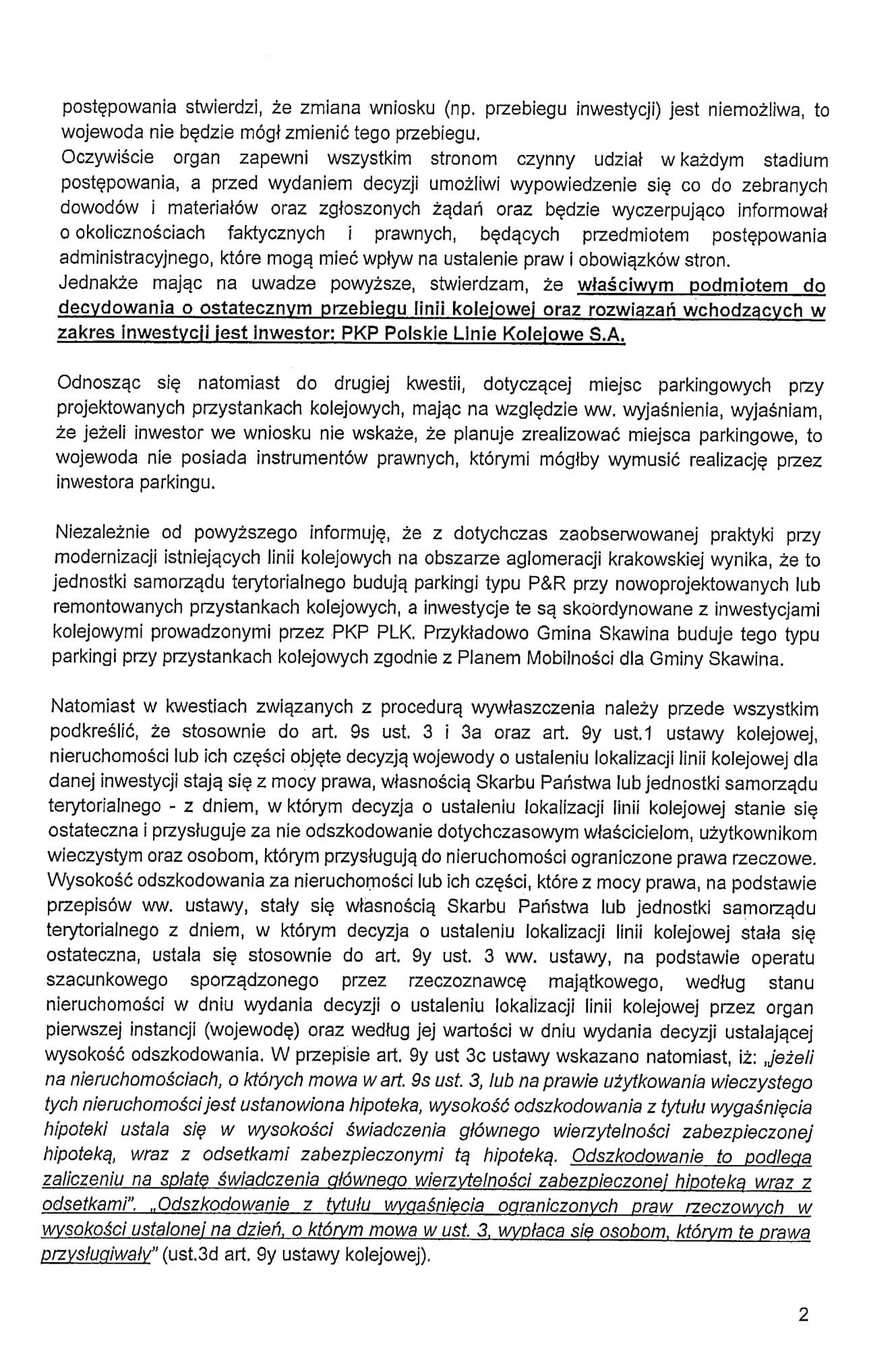 Odpowiedz Wojewody jasno potwierdza, że podmiotem właściwym do decydowania o ostatecznym przebiegu linii kolejowej oraz rozwiązaniach wchodzących w zakres inwestycji jest inwestor: PKP Polskie Linie Kolejowe S.A.