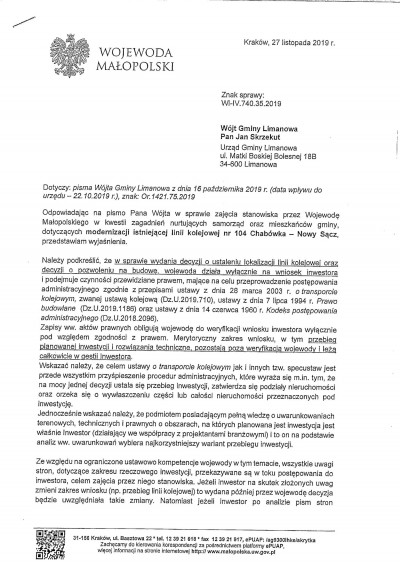 Zgodnie z Państwa postulatami jakie sformułowano w trakcie spotkań informacyjnych dotyczących inwestycji kolejowej na terenie naszej gminy, zwróciliśmy się do Wojewody Małopolskiego z kilkoma zapytaniami. W związku z odpowiedzią Wojewody na nasze pismo w załączeniu publikujemy treść zapytania jak i udzieloną odpowiedz.