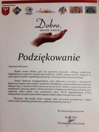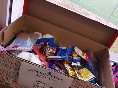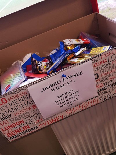 Cała społeczność szkolna włączyła się także w powiatową akcję zbiórki słodyczy i artykułów piśmienniczych „Dobro zawsze wraca”, której celem była pomoc osobom z niepełnosprawnością. Samorząd szkolny i Szkolne Koło Wolontariatu zorganizowali loterię fantową oraz ciastkowy kiermasz na cele charytatywne. Przekazali zebrane dary w postaci słodyczy, materiałów piśmienniczych i dekoracyjnych, a także dodatkowo wsparli akcję przekazując przysłowiową „złotówkę”.