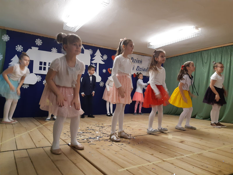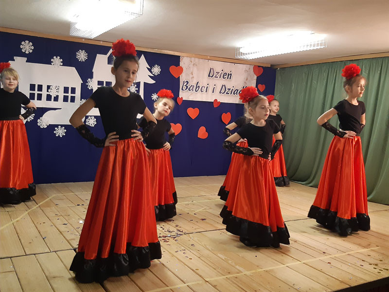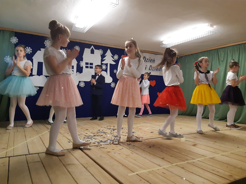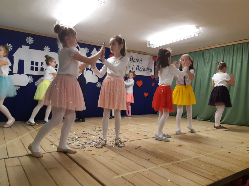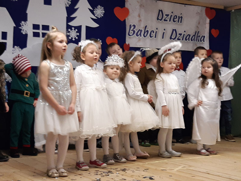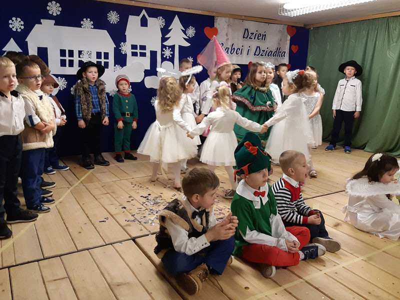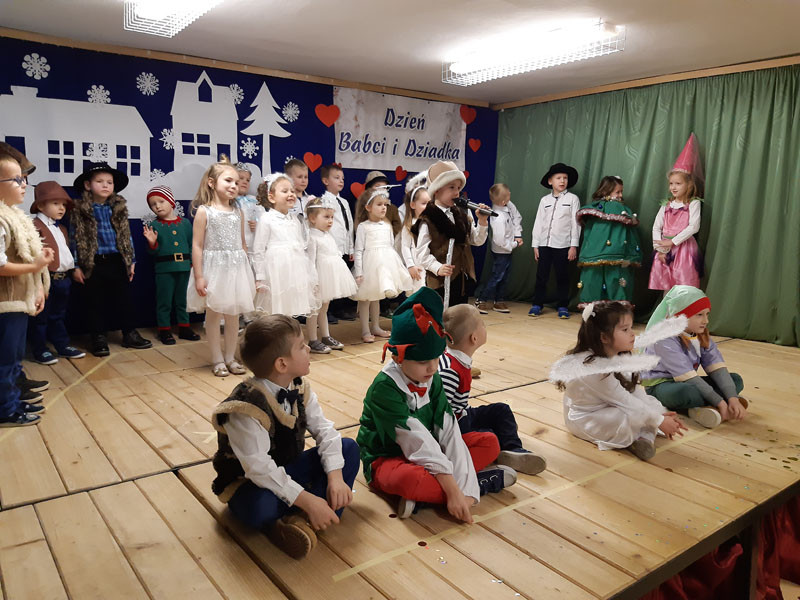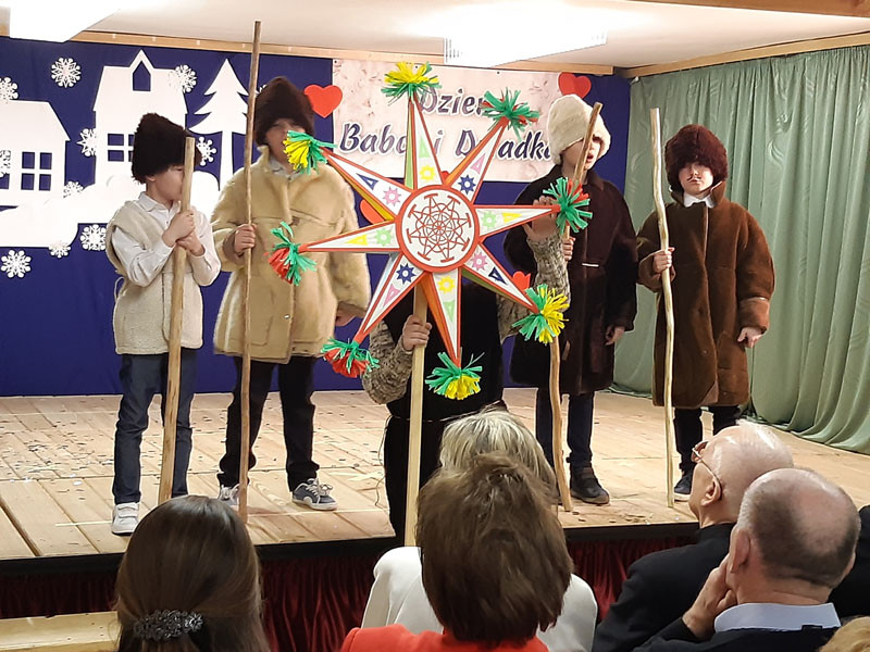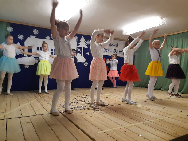 Część artystyczna rozpoczęła się od tańca aniołów w wykonaniu uczennic z klasy V. Następnie dzieci z klas 0 – III przedstawiły montaż słowno – muzyczny, przygotowany pod kierunkiem swoich wychowawców. Były to wzruszające wiersze i piosenki okolicznościowe związane tematycznie z Dniem Babci i Dziadka. Nie zabrakło też radosnych tańców - „Chocolade” w wykonaniu uczniów klasy drugiej oraz „Tańca hiszpańskiego” w wykonaniu uczniów klasy trzeciej. Uroczystość uświetnił występ dziecięcej Grupy Kolędniczej z Gwiazdą oraz młodzieżowej grupy „Trzej Królowie”.