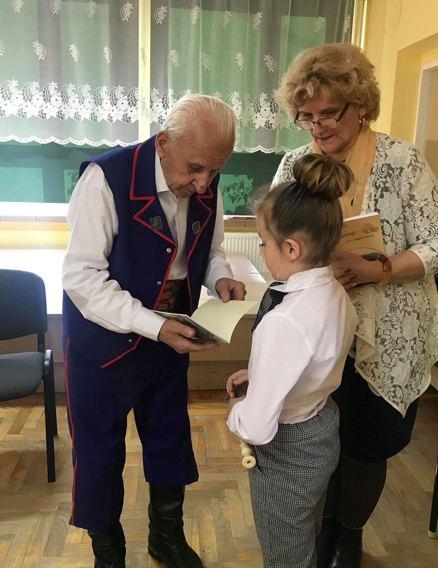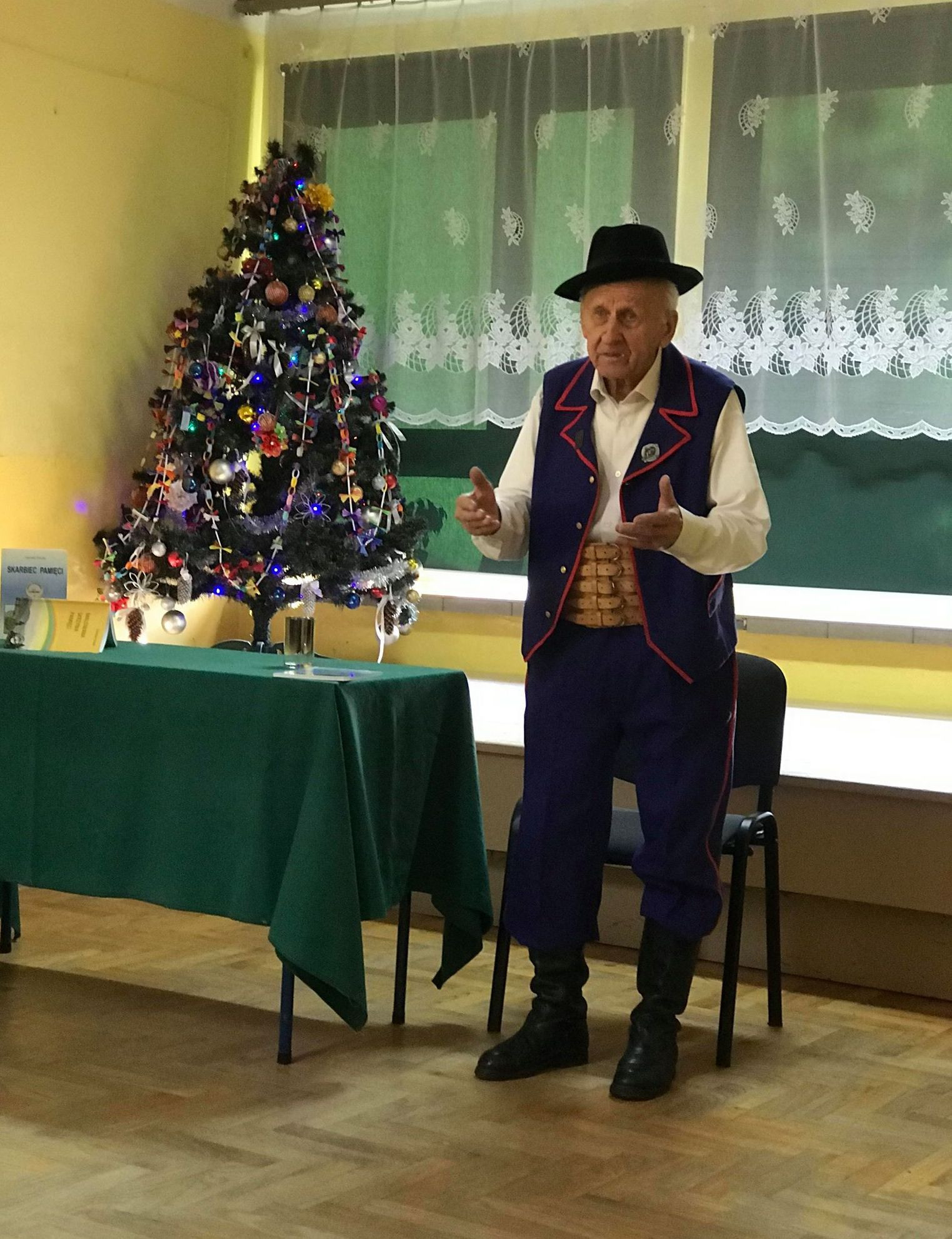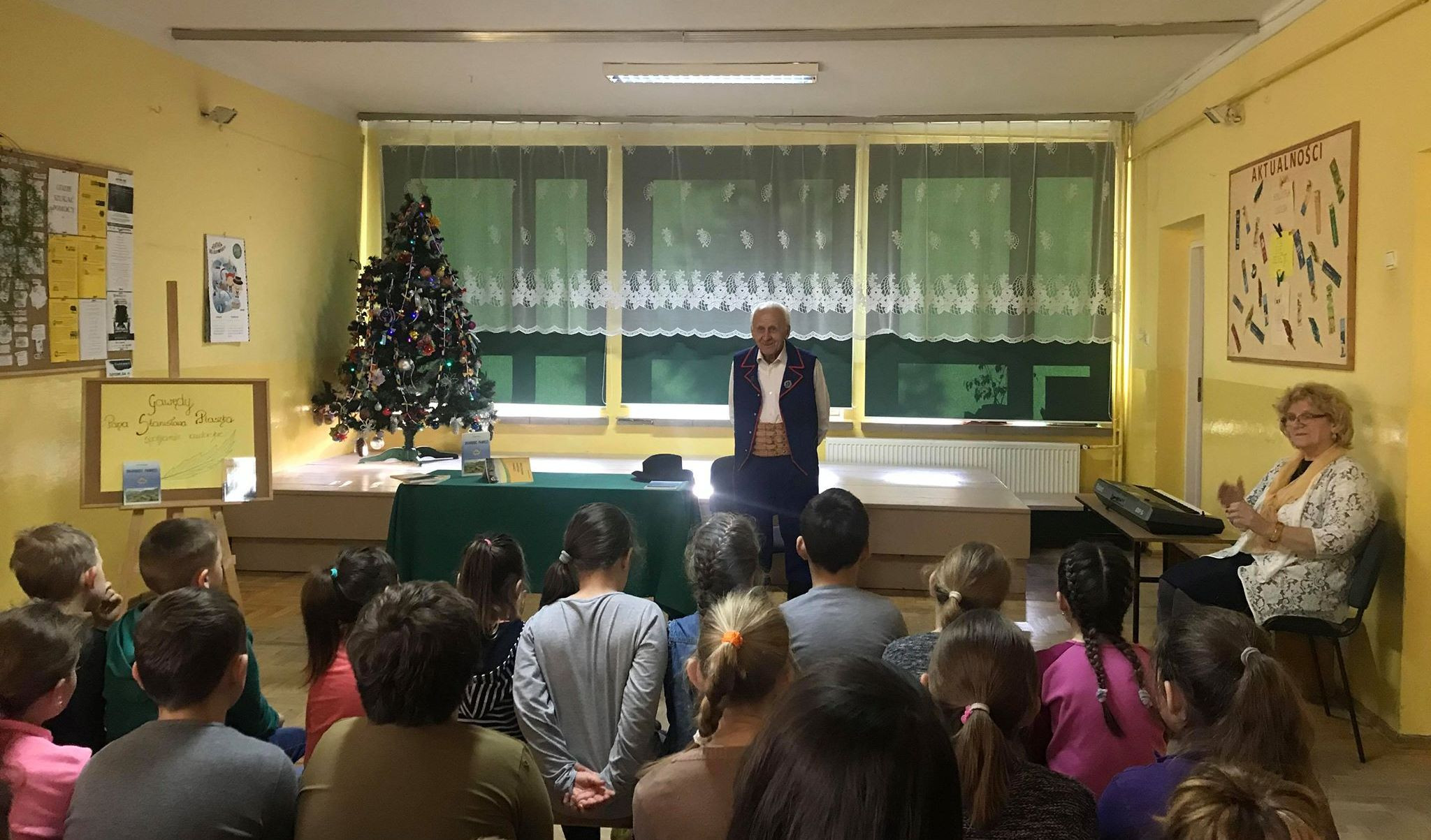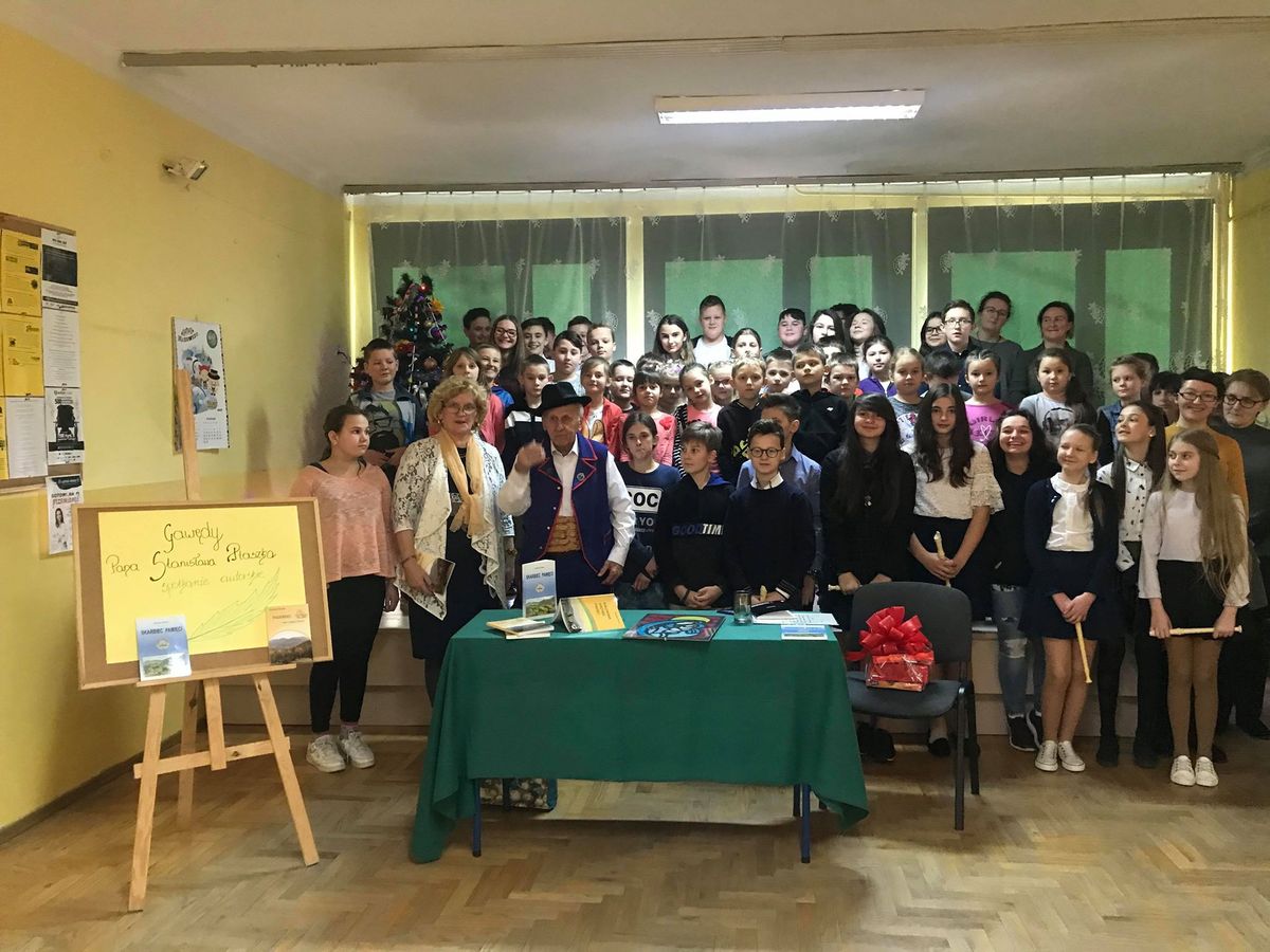 Spotkanie przebiegło w miłej atmosferze, uświetnione zostało występem uczniów, którzy na fletach wygrywali kolędy i wszyscy wspólnie śpiewali. Uczestnicy żywo zaangażowali się w spotkanie, zadawali gawędziarzowi wiele pytań dotyczących jego twórczości, życia i pisarskich inspiracji. Dyrektor Szkoły Halina Śmierciak dziękuje Marii Trzupek, Katarzynie Ziaja, Agnieszce Leśniak oraz Przewodniczącej Samorządu Uczniowskiego Marcelinie Młynarczyk za przygotowanie tego niezwykłego wydarzenia.