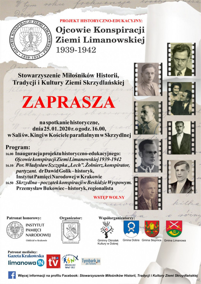 W dniu 25 stycznia 2020 r. o godz. 16.00 w Sali św. Kingi, w Kościele Parafialnym Skrzydlnej odbędzie się spotkanie historyczne organizowane w ramach projektu historyczno-edukacyjnego, realizowanego przez Stowarzyszenie Miłośników Historii, Tradycji i Kultury Ziemi Skrzydlańskiej przy współpracy z samorządami: Gminą Dobra, Gminą Limanowa oraz Gminą Słopnice.