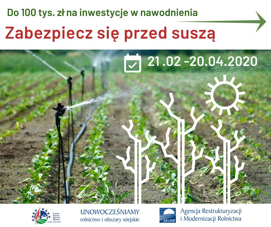 Od 21 lutego do 20 kwietnia 2020 r. rolnicy, którzy chcą zabezpieczyć swoje uprawy przed skutkami suszy, mogą ubiegać się w ARiMR o dotację na inwestycje w nawadnianie gospodarstwa rolnego.