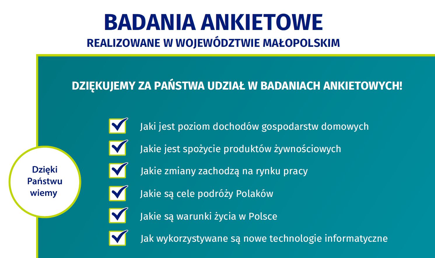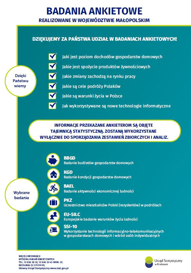 Wszystkie badania ankietowe na terenie województwa małopolskiego realizowane są przez pracowników Urzędu Statystycznego w Krakowie (ankieterów i teleankieterów statystycznych) metodą wywiadu bezpośredniego lub wywiadu telefonicznego w gospodarstwach domowych, gospodarstwach rolnych, punktach usługowych, targowiskach oraz na przejściach granicznych. Każdy z ankieterów posiada legitymację służbową podpisaną przez Dyrektora Urzędu Statystycznego w Krakowie oraz upoważnienie do przeprowadzenia badań ankietowych na terenie województwa małopolskiego.