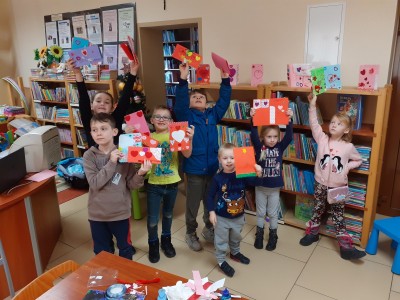 W drugiej części spotkania bibliotekarki Lidia Piegza i Małgorzata Cięciel przeprowadziły warsztaty plastyczno manualne „Quilling kartki walentynkowe”. Dzieci z wąskich pasków papieru zwiniętych w kształt sprężyny spiralnej i odpowiednio uformowanych przez zagniecenie zewnętrznych warstw papieru stworzyły piękne kartki. Uczestnicy oprócz tego sposobu mieli dowolność wykonywania prac różnymi technikami plastycznym. Trzeba przyznać, że własnoręczne robienie kartek walentynkowych pochłonęło dzieci bez reszty. Jak widać, kreatywne plastyczne zajęcia mogą być doskonałą alternatywą spędzania wolnego czasu i śmiało mogą konkurować z komputerowymi zabawami.