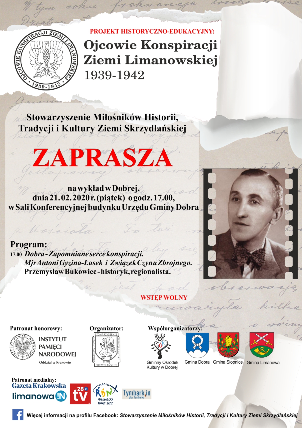 Stowarzyszenie Miłośników Historii Tradycji i Kultury Ziemi Skrzydlańskiej, zaprasza na drugi wykład w ramach projektu edukacyjno- historycznego:  "Ojcowie konspiracji Ziemi Limanowskiej 1939-1942" do Urzędu Gminy Dobra (sala konferencyjna) w najbliższy piątek  -  21 lutego.