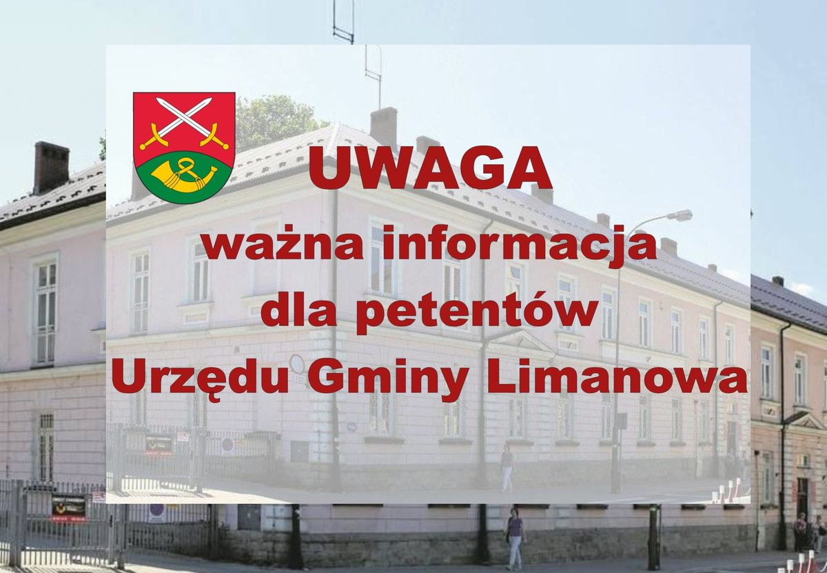 Mając na uwadze sytuację związaną z rozprzestrzenianiem się koronowirusa, APELUJEMY by do Urzędu Gminy Limanowa przychodzić jedynie w sprawach pilnych - wymagających bezpośredniej wizyty w Urzędzie.