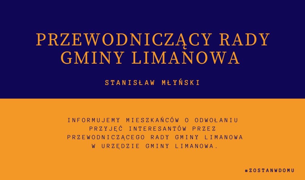 Informujemy mieszkańców, że w związku z zaistniałą sytuacją w Polsce Przewodniczący Rady Gminy Limanowa odwołuje przyjmowanie interesantów w Urzędzie Gminy Limanowa.