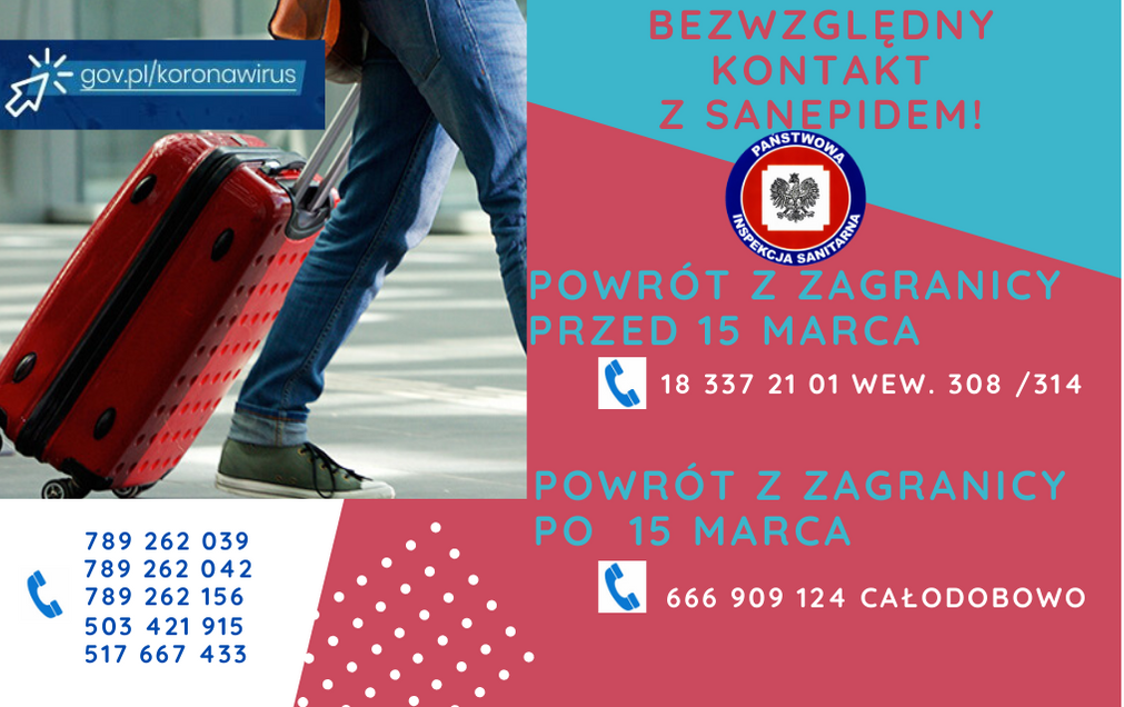 Po powrocie z zagranicy - bezwzględnie skontaktuj się z SANEPIDEM! SANEPID zgodnie z procedurą kwalifikuje do odbycia kwarantanny.