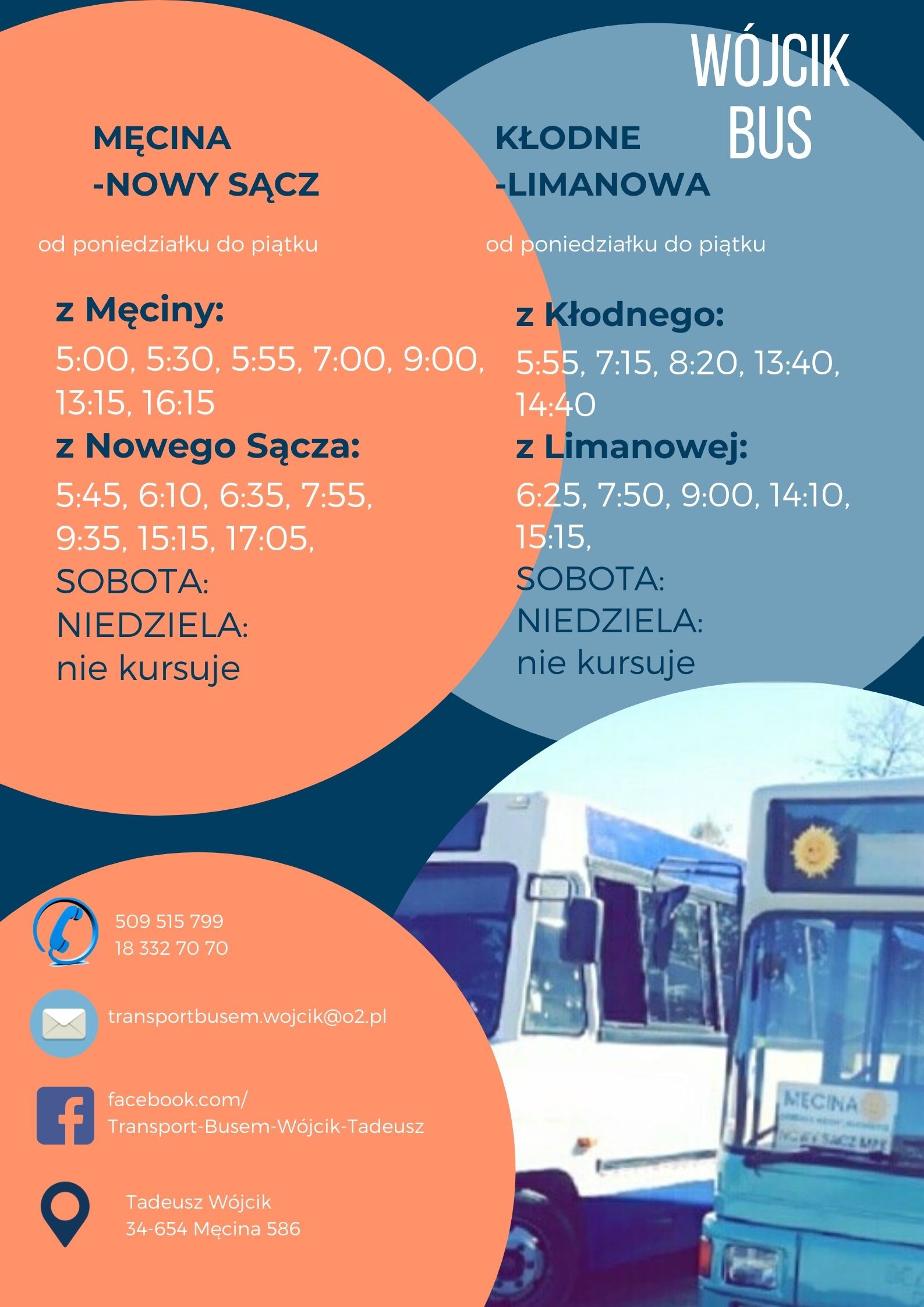 W związku z panującymi warunkami, dbając o bezpieczeństwo Pasażerów oraz Kierowcow, od dnia 25. 03.2020 r. do odwołania firma przewozowa Transport Busem Wójcik Tadeusz z Męciny zredukowała do minimum ilość kursów o czym chce poinformować mieszkanców gminy Limanowa. Rozkład jazdy w zależności od panujących warunków może ulec zmianie o czym właściciele bedą na bieżąco informować mieszkańców gminy.