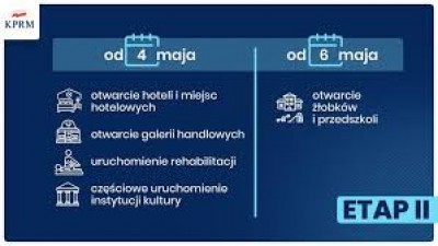 Po majowym weekendzie otwarte zostaną centra handlowe, sklepy budowlane będą czynne w weekendy, a hotele wznowią działalność. Osoby chore powrócą do rehabilitacji, a biblioteki i instytucje kultury będą stopniowo otwierane po konsultacjach z sanepidem. Wprowadzone zostaną także zmiany w funkcjonowaniu przedszkoli i żłobków. To drugi etap znoszenia ograniczeń związanych z COVID-19.