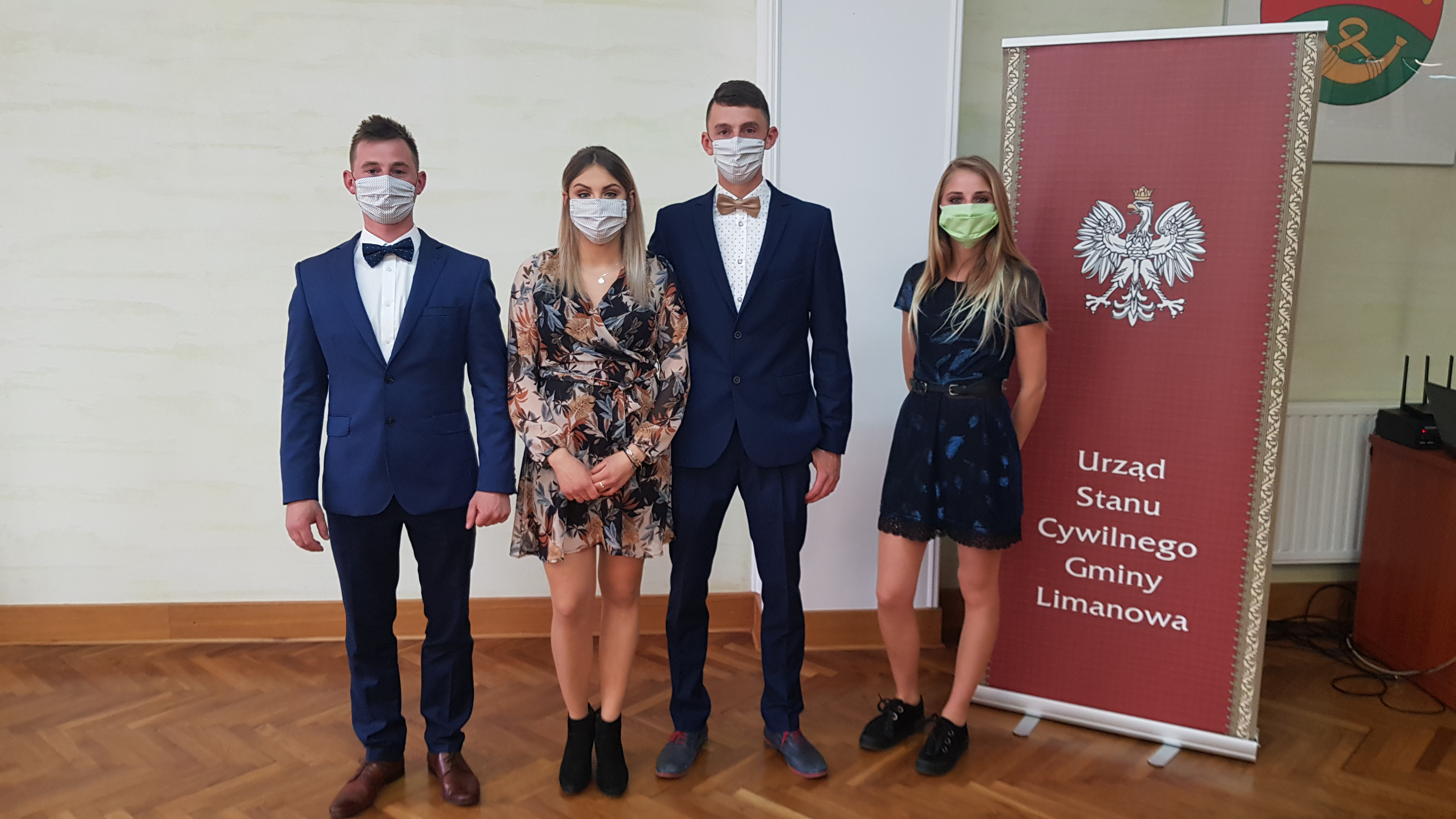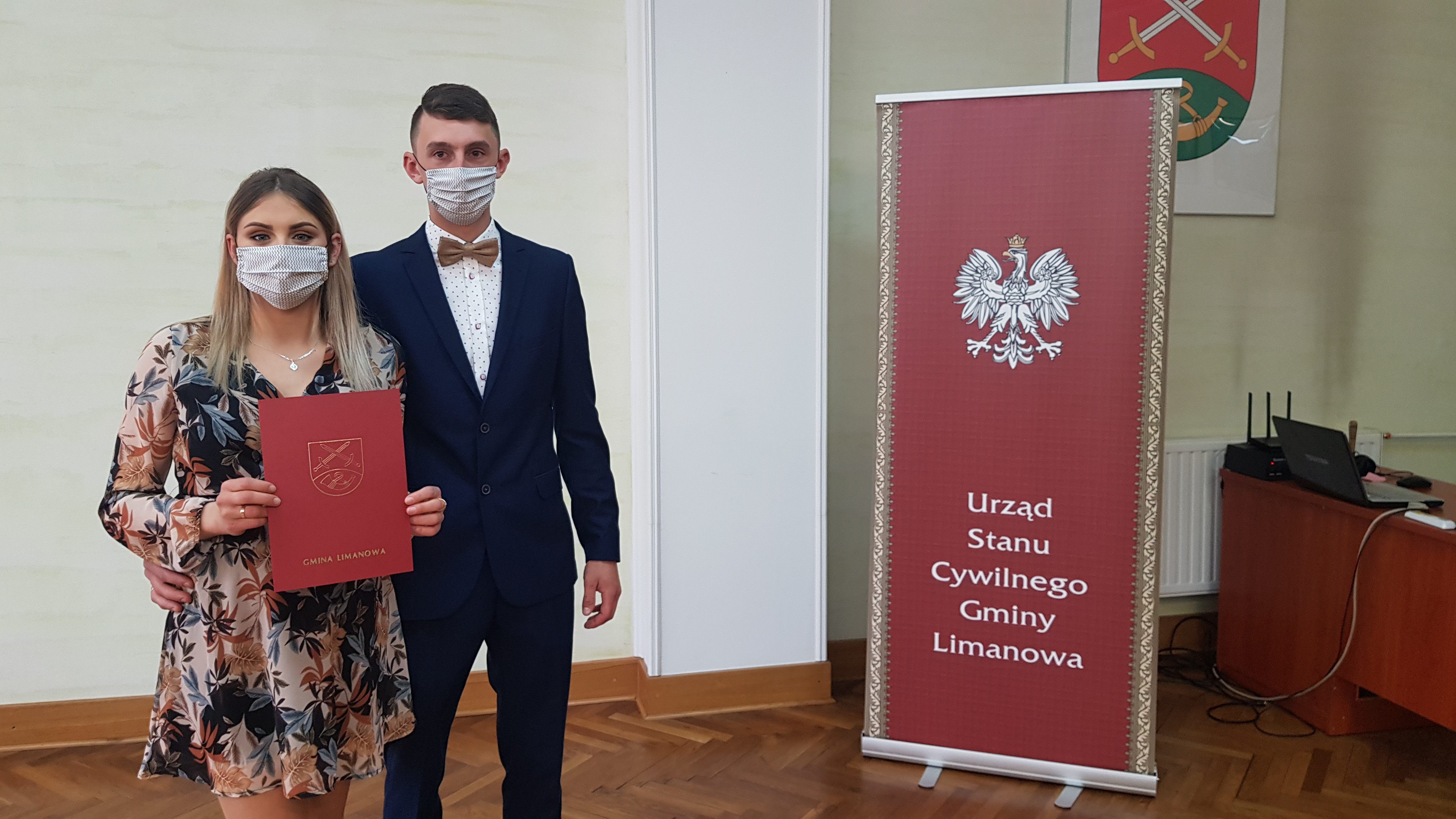 Poniżej zdjęcia ze ślubu cywilnego udzielonego w Urzędzie Gminy Limanowa w czasie trwania epidemii.