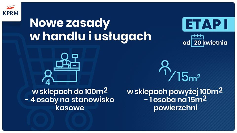 - nowe zasady handlu i usługach - w sklepach do 100m2 obsługa 4 klientów na jedną kasę, powyżej 100m2 - 1 osoba na 15m2)