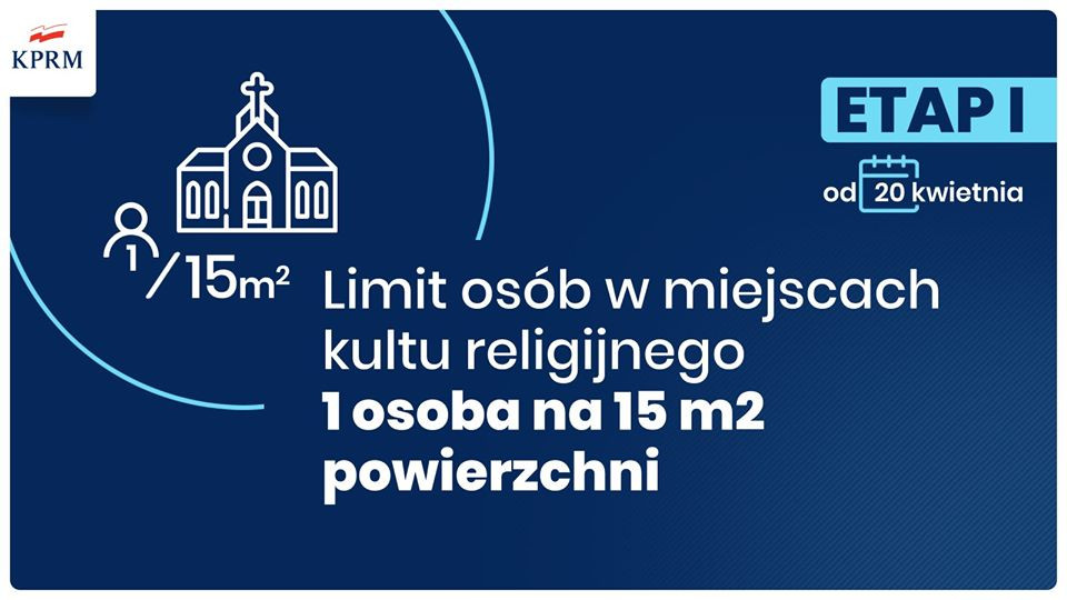 - miejsca kultu religijnego - zasada 1 osoba na 15m2 będzie obowiązywała także w kościołach (dotyczy to również pogrzebów)